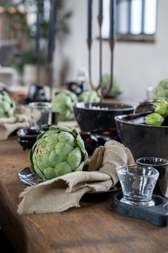 Zachte stoffen en natuurlijke tinten zorgen voor warmte en comfort. Denk aan plaids, kussens en ander textiel dat niet alleen praktisch is, maar ook sfeer toevoegt. Daarnaast ook mooie items om je tafel compleet te maken, denk aan servetten, pannenlappen en handdoeken. Perfect om je interieur een rustieke en aardse uitstraling te geven, waarin je je direct thuis voelt.