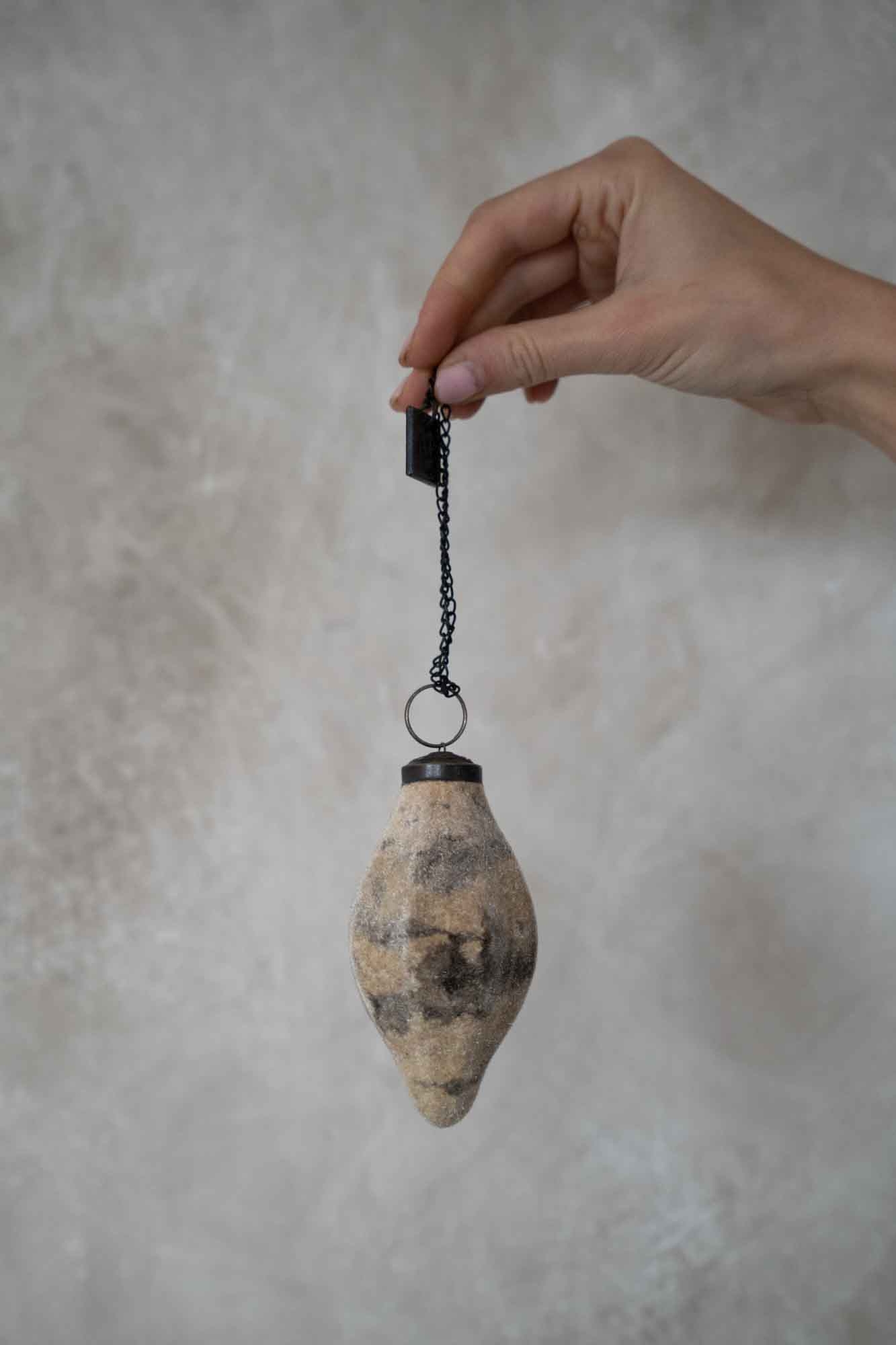 De Aura Peeperkorn kerstbal is een stijlvolle toevoeging aan de feestdagen. De glazen bal is bekleed met een zachte fluwelen laag, wat zorgt voor een luxe en warme uitstraling. Het metalen ophangoog en het fijne kettinkje geven de kerstbal een stoer en verfijnd detail.
