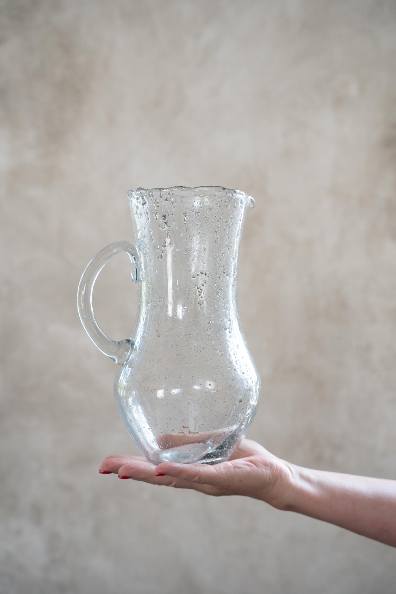 Deze waterkan van handgemaakt glas is zowel praktisch als stijlvol. Het heldere glas heeft een subtiele, ambachtelijke uitstraling met kleine luchtbubbeltjes die elk exemplaar uniek maken.