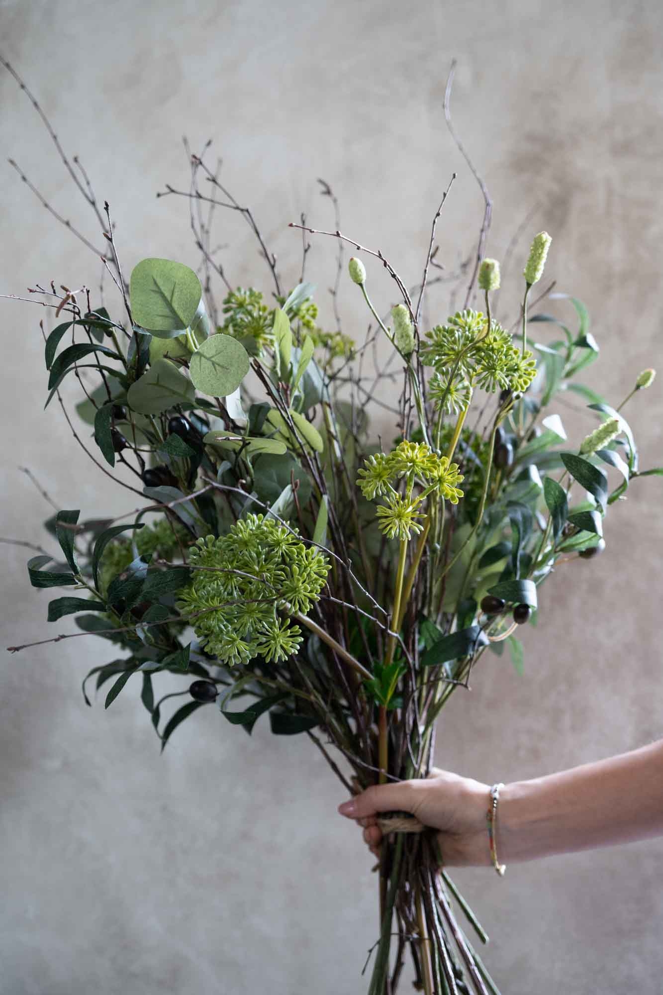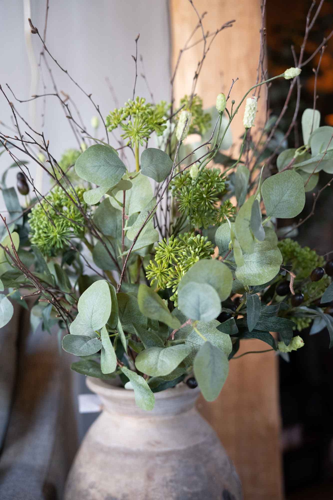 Boeket Am straalt rust, eenvoud en natuurlijke elegantie uit. Met een verfijnde mix van eucalyptus, groene bloemtakken en lichte berk brengt dit boeket een fris en tijdloos karakter in huis. De zachte groentinten en natuurlijke vormen zorgen voor een ontspannen, landelijke uitstraling. Perfect voor elk seizoen.