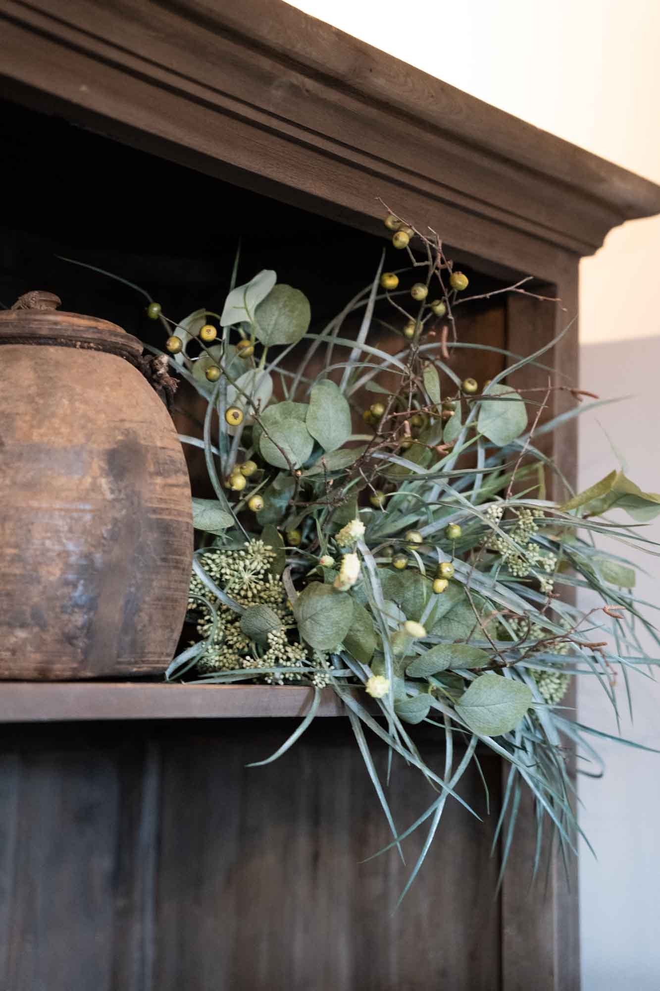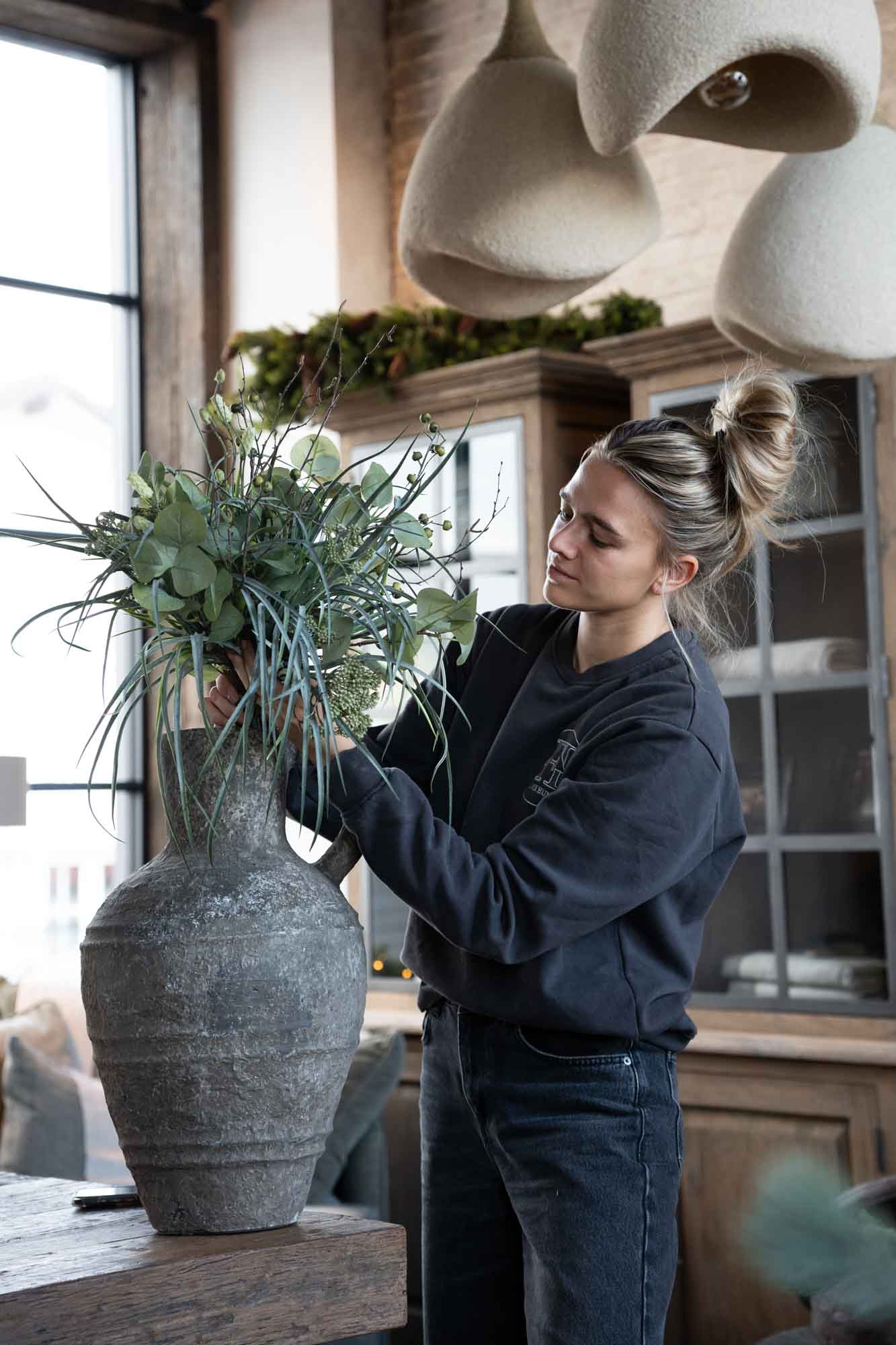 Dit met zorg samengestelde boeket bestaat uit eucalyptusblad, groene bessen, grassen en subtiele takjes. Perfect in balans voor een rustige, landelijke uitstraling. Dankzij de natuurlijke tinten past Jip moeiteloos in elk interieur en elk seizoen.