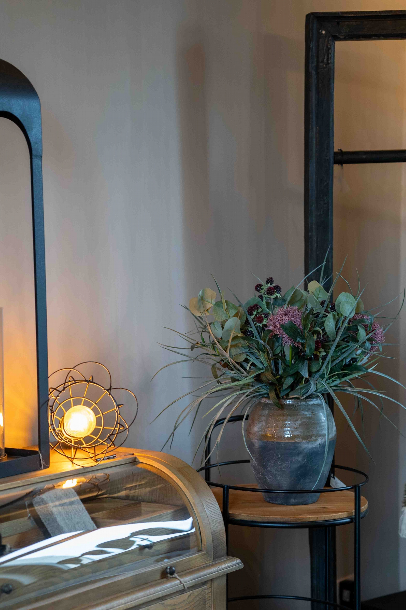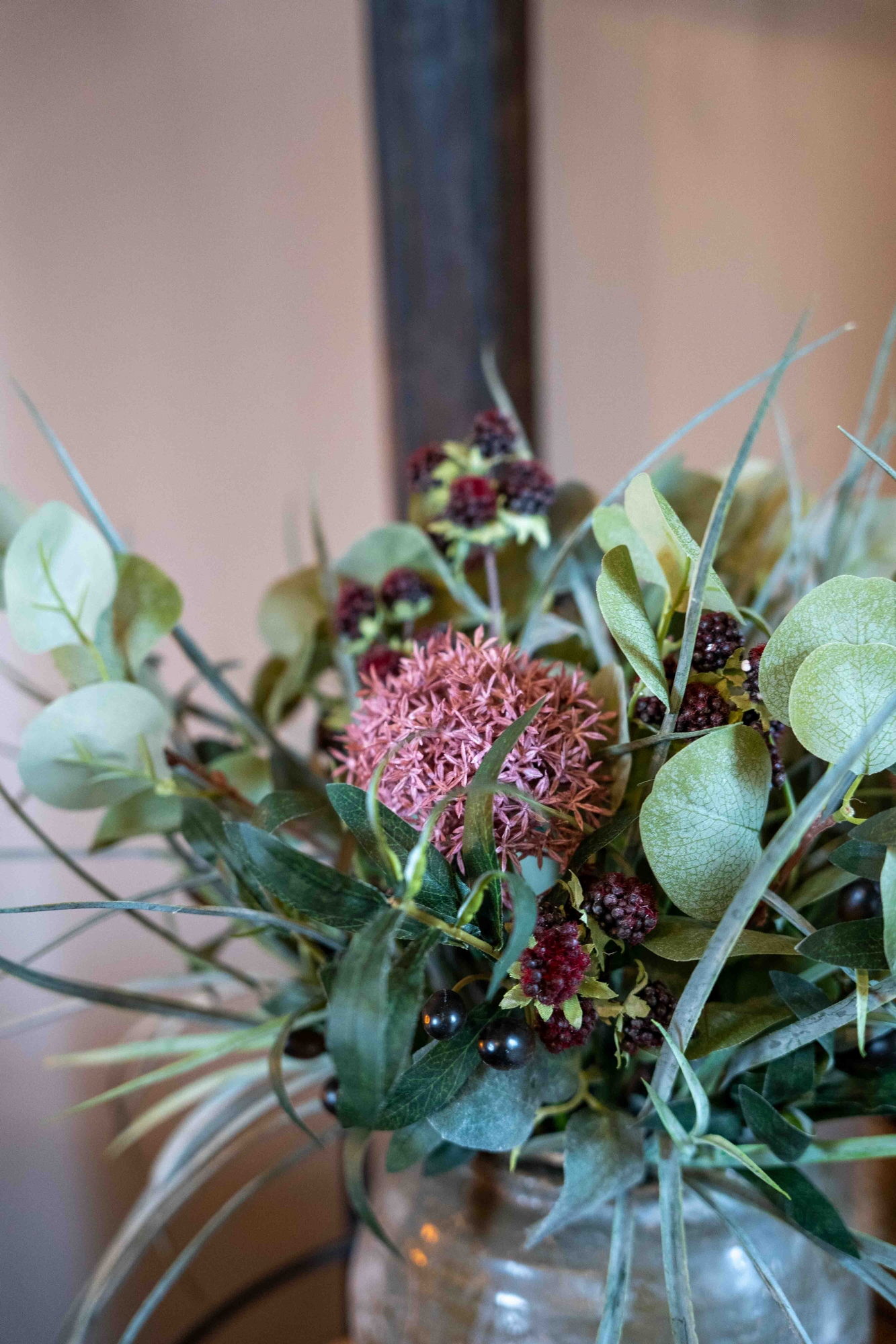 Boeket Olivia is een stijlvol kunstboeket met eucalyptusbladeren, fijne grasachtige sprieten, decoratieve besjes en een opvallend roze bloeiaccent. De combinatie van verschillende structuren en groentinten, aangevuld met warme rood- en rozetinten, zorgt voor een rijk en sfeervol geheel. Het boeket heeft een natuurlijke, elegante uitstraling en vormt een subtiele blikvanger in elk interieur. Doordat het boeket volledig uit kunstmaterialen bestaat, blijft het altijd mooi zonder onderhoud en is het een duurzame toevoeging aan je woonruimte.