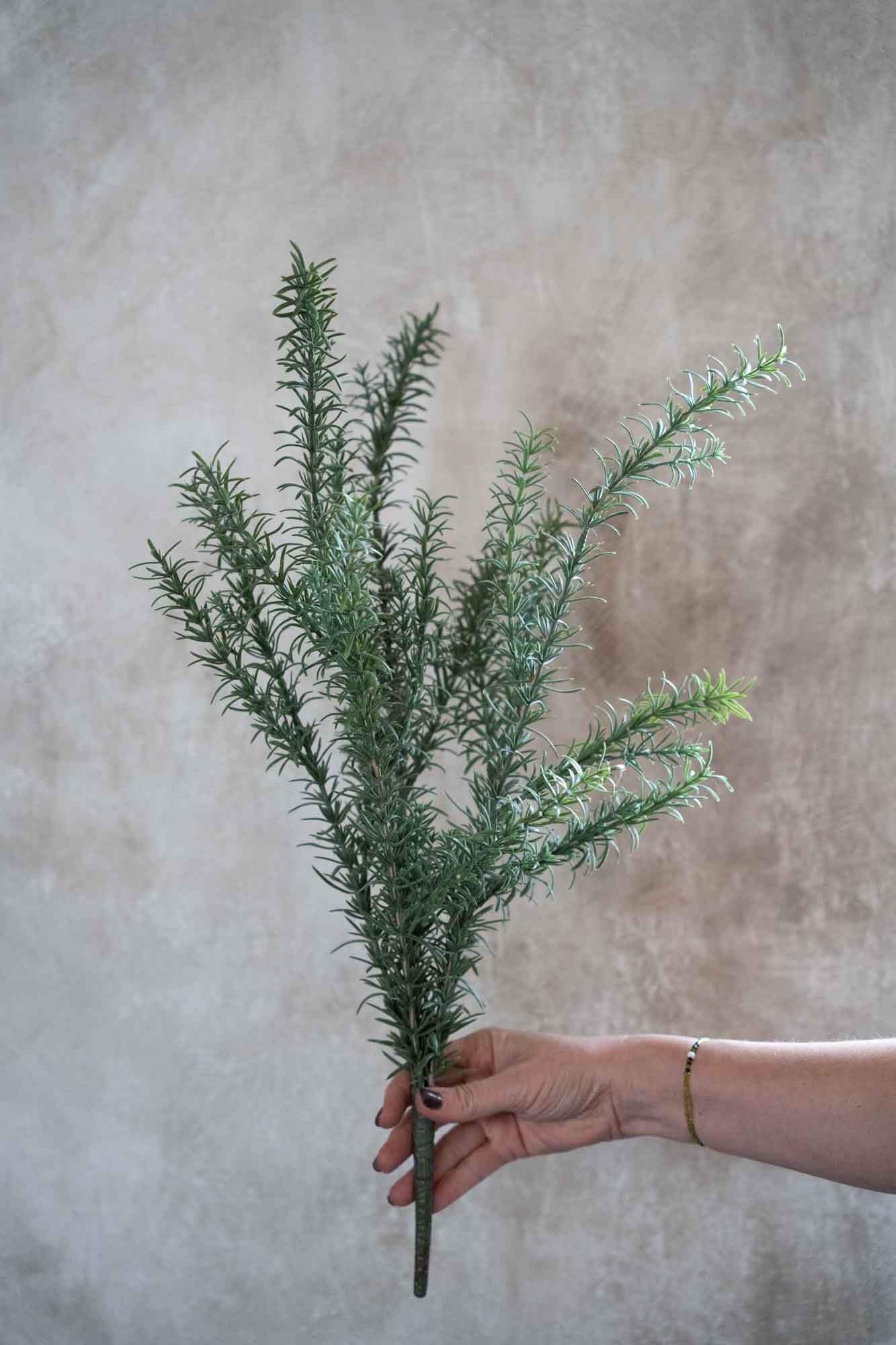 Een realistisch bosje kunst-rozemarijn met fijne, groene naaldachtige blaadjes en een natuurlijke vorm.Makkelijk te verwerken in potten, vazen of bloemstukken en perfect te combineren met andere kunstkruiden of groen. Het bosje blijft altijd mooi in kleur en vorm, zonder onderhoud.