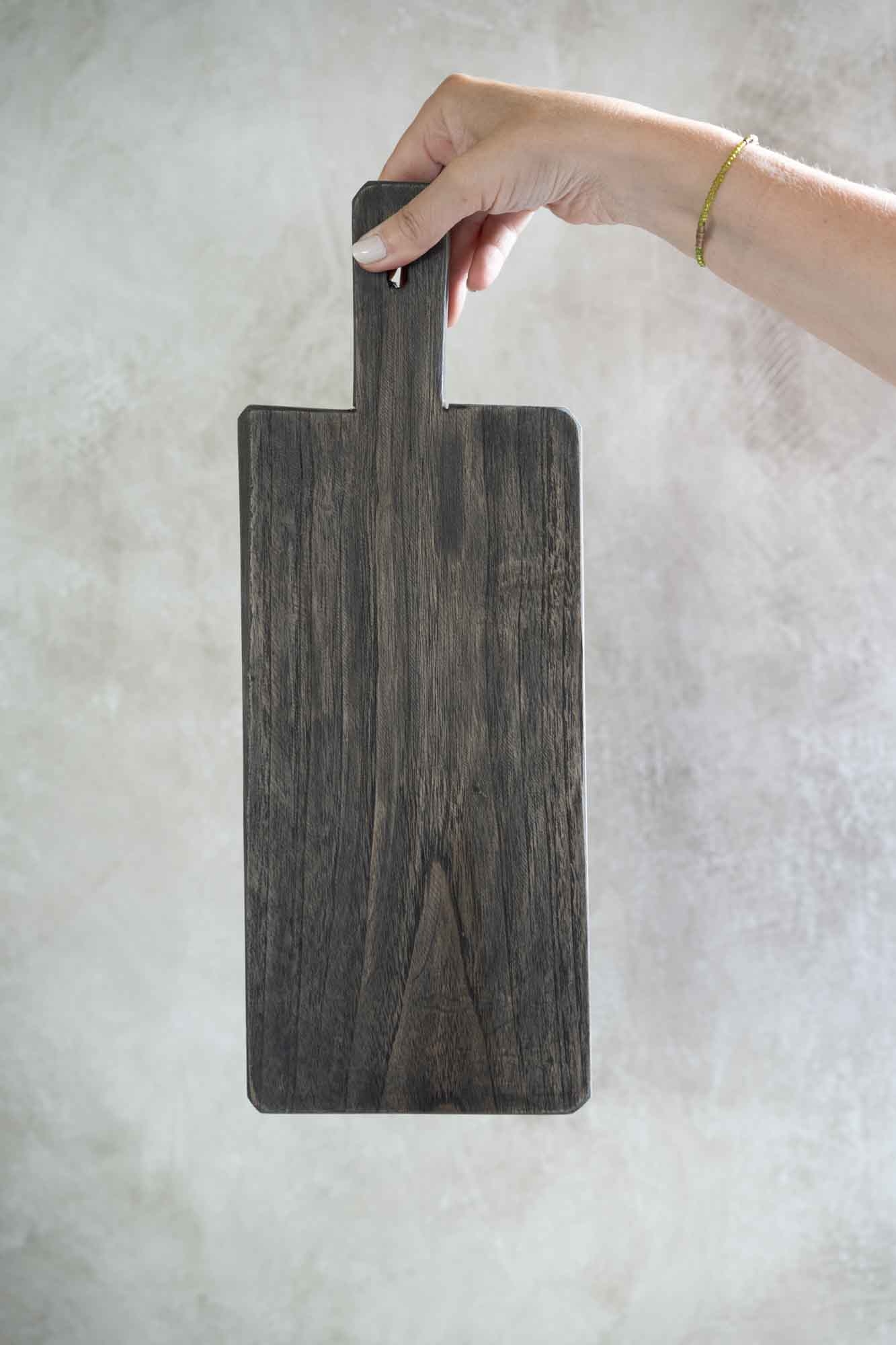 Broodplank Lars, een stoere houten plank met een robuuste en authentieke uitstraling. Gemaakt van hout en afgewerkt in een donkere, verweerde tint. Het praktische handvat met ophangoog maakt de plank niet alleen handig in gebruik, maar ook decoratief om aan een haak of rek in de keuken te hangen.