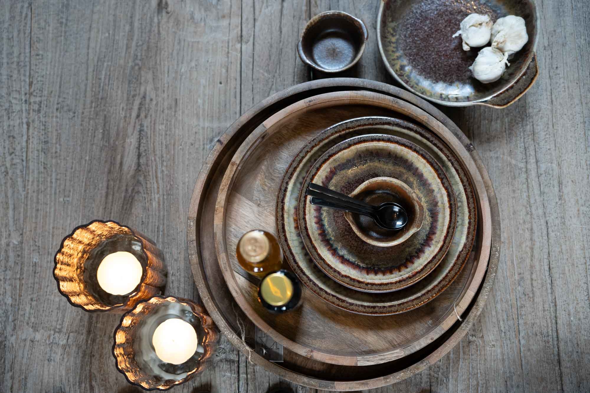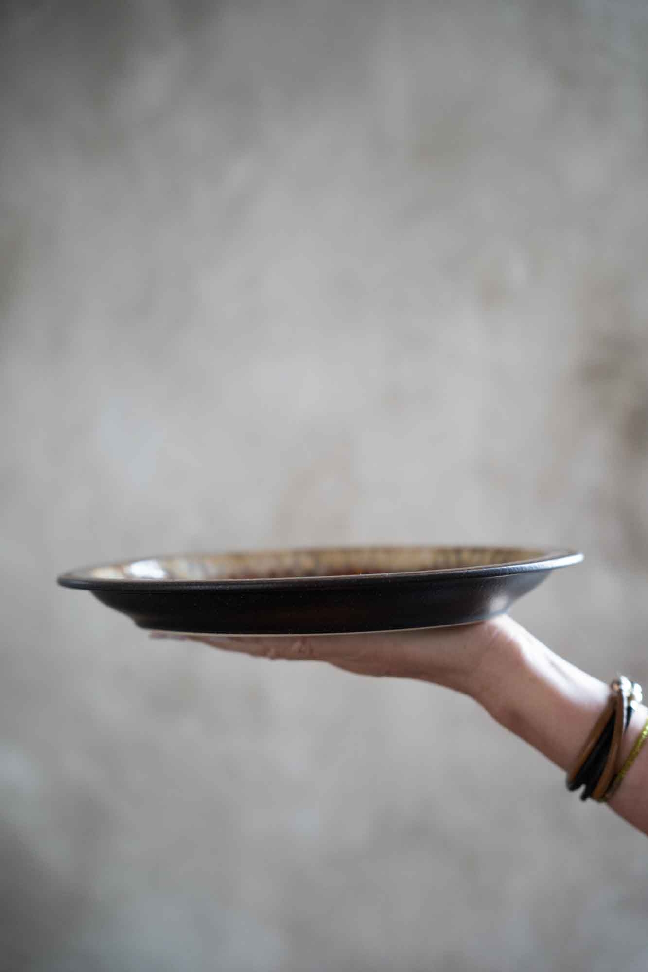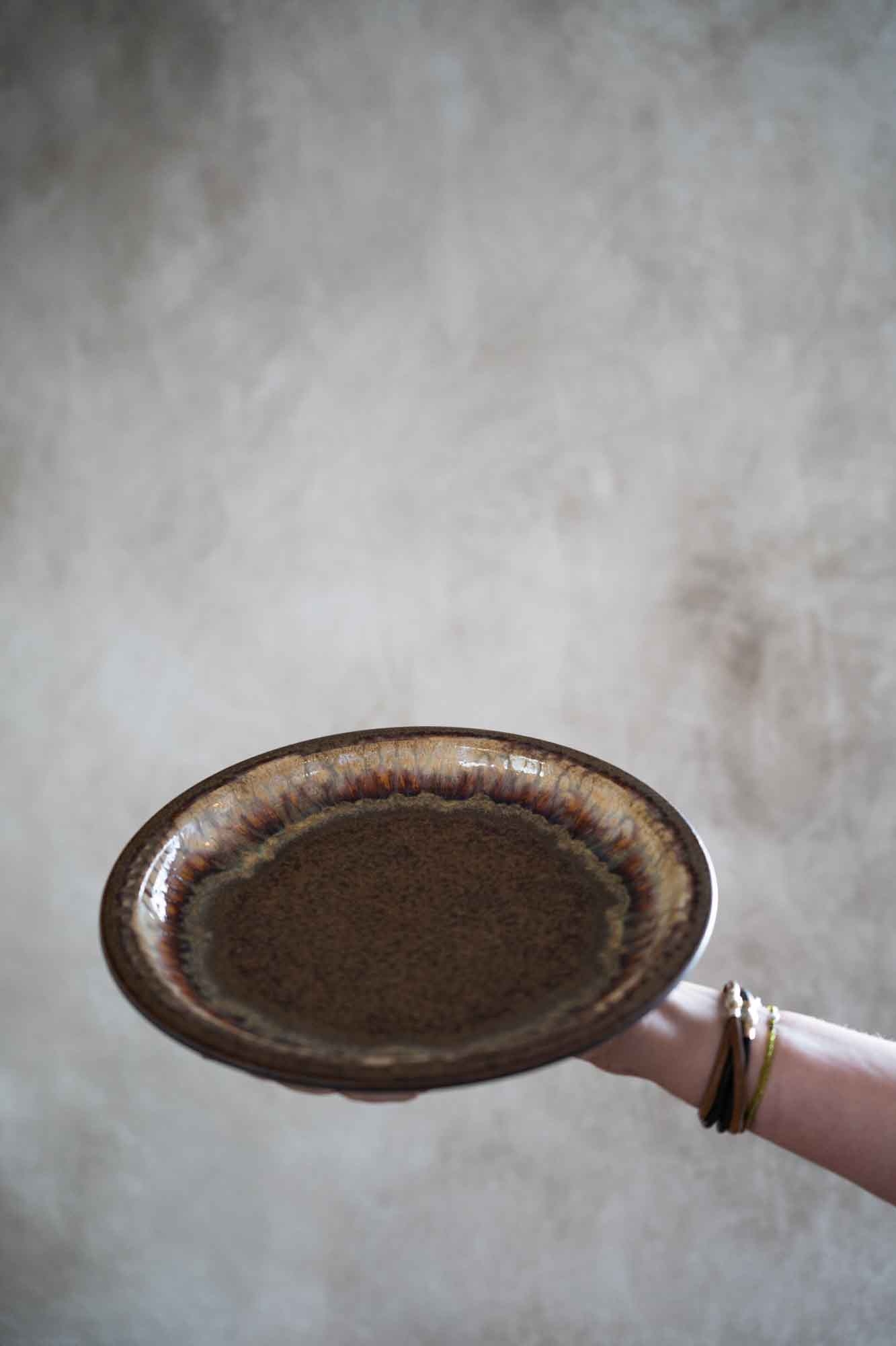 Dit dinerbord brengt warmte en elegantie naar de eettafel. Het bord is afgewerkt met een diepbruine glazuurlaag die langs de rand prachtig overloopt in lichtere tinten met een subtiele gloed. De natuurlijke schakeringen maken elk bord sfeervol en levendig.