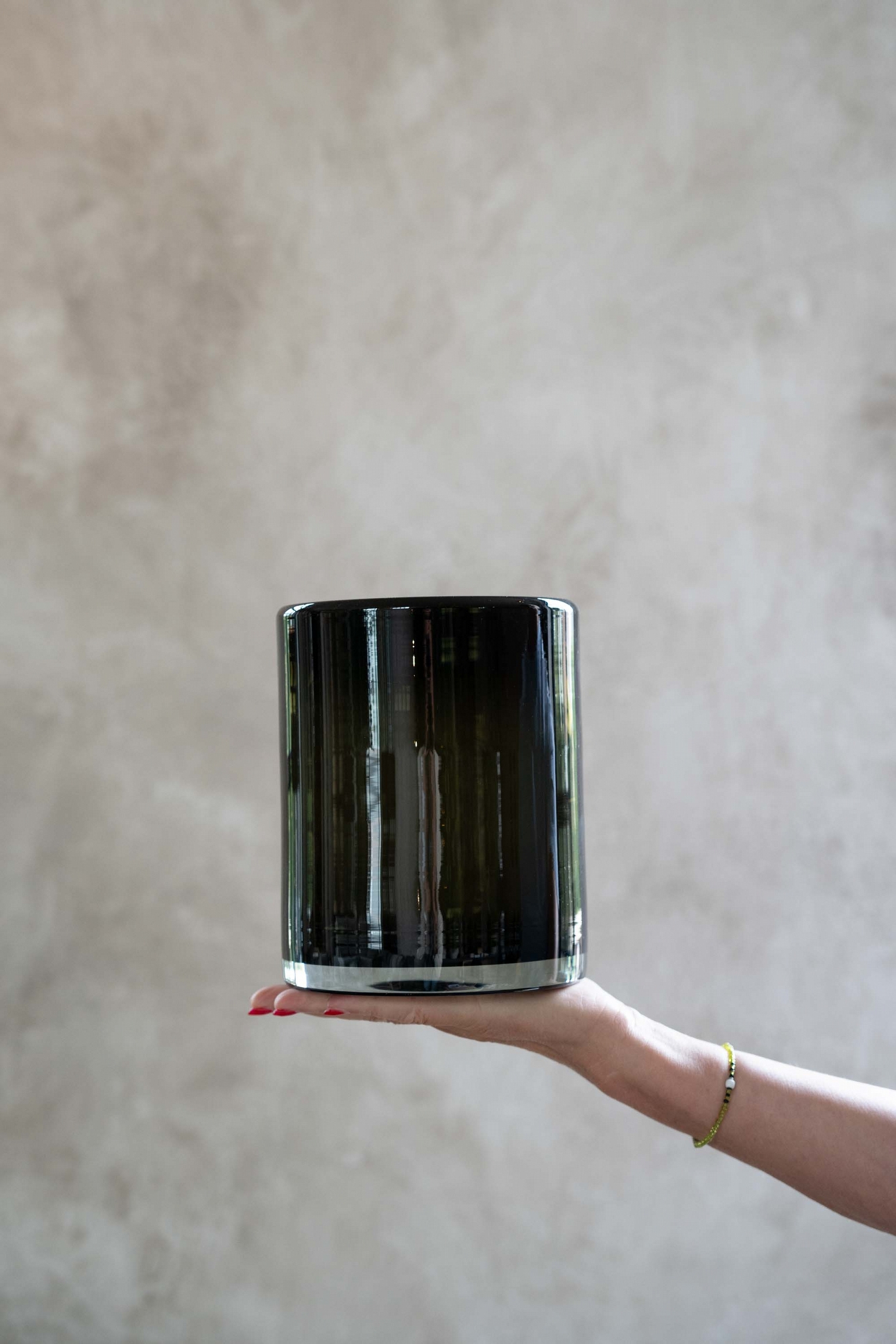 Een ideale maat voor op een sidetable of naast het bad. Dit windlicht van DutZ is mondgeblazen en heeft een diepe smoke-tint die mooi combineert met hout, steen en linnen. Gebruik het met een kaars voor een warme sfeer of zet er een bos bloemen in. De opening is breed genoeg voor dikkere stelen. Mooi te combineren met andere maten.