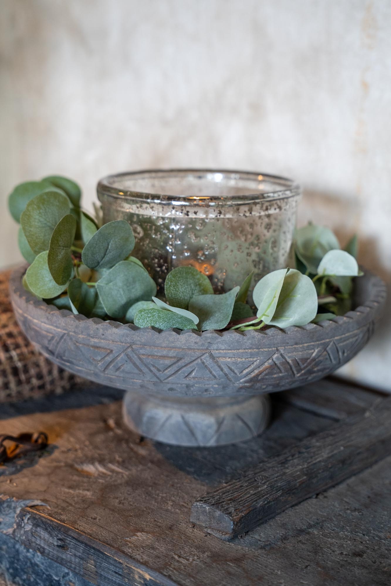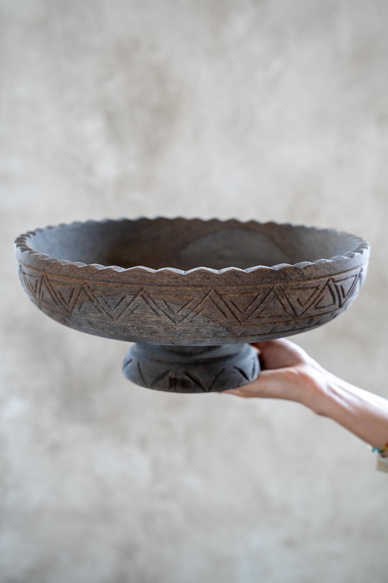 Deze houten schaal op voet is een prachtig handgemaakt stuk met verfijnde gravures langs de rand en zijkant.