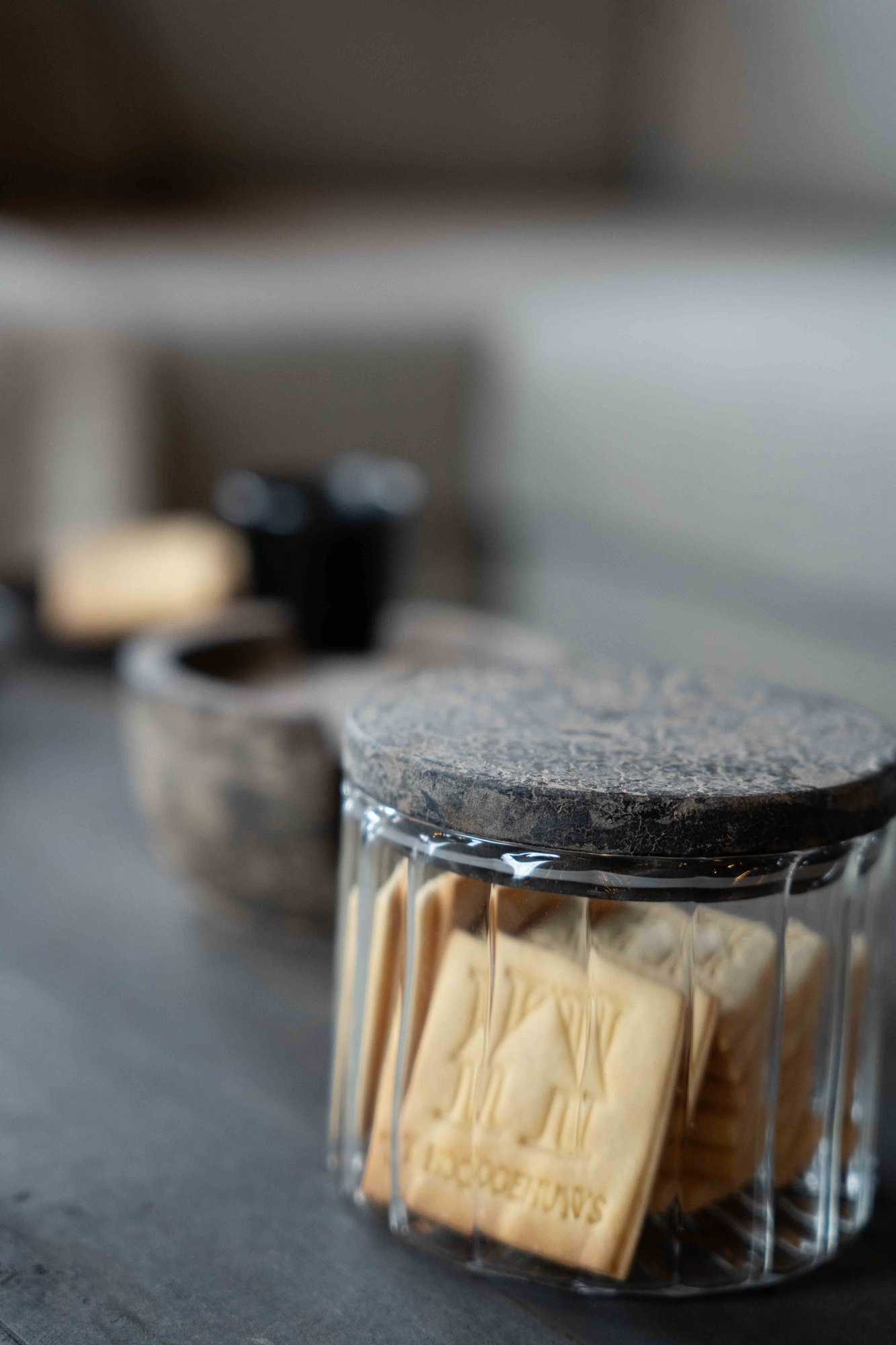 Een tijdloze opberger, vervaardigd uit helder geribd glas en afgewerkt met een robuust deksel in natuursteen-look. Hij straalt eenvoud en verfijning uit, en is ideaal voor het bewaren van kruiden, thee of kleine lekkernijen. Dankzij het pure ontwerp past hij moeiteloos in zowel een modern als landelijk interieur. Combineer deze pot met de andere maten uit de collectie voor een mooi geheel, perfect in de keuken, woonkamer of zelfs in de badkamer.