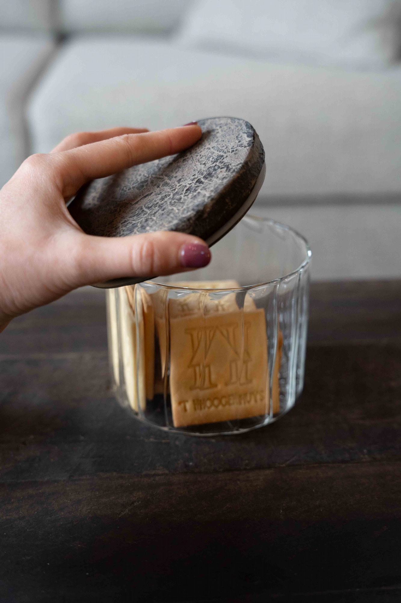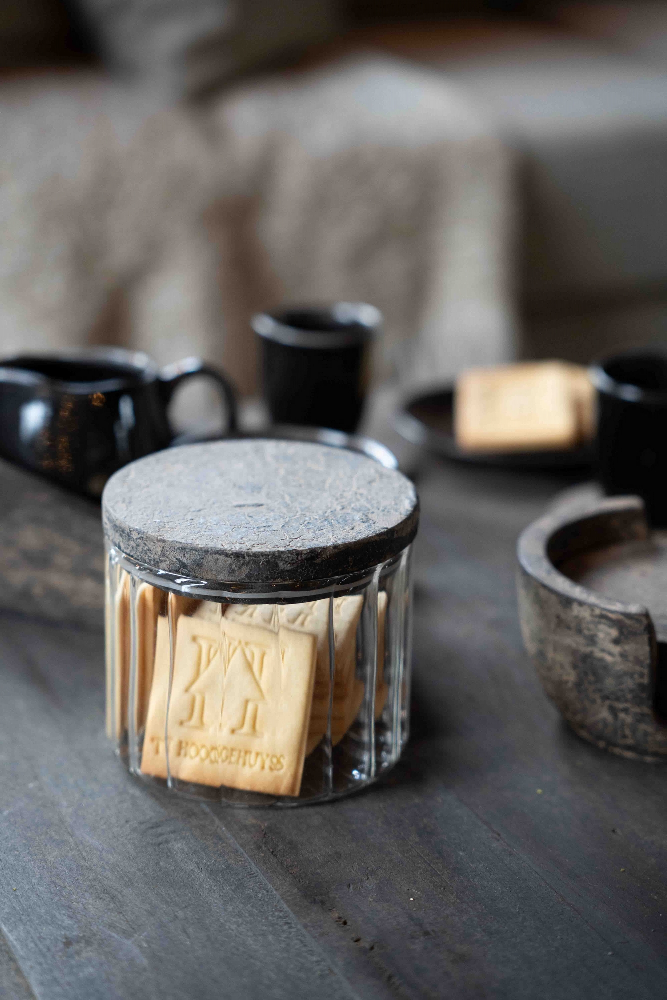 Een tijdloze opberger, vervaardigd uit helder geribd glas en afgewerkt met een robuust deksel in natuursteen-look. Hij straalt eenvoud en verfijning uit, en is ideaal voor het bewaren van kruiden, thee of kleine lekkernijen. Dankzij het pure ontwerp past hij moeiteloos in zowel een modern als landelijk interieur.