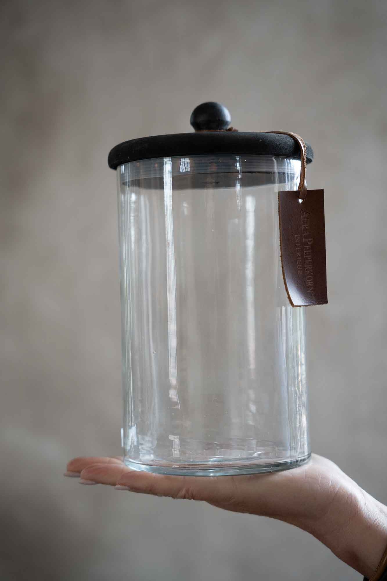 Deze glazen pot van Aura Peeperkorn is een stijlvolle en praktische toevoeging aan je keuken of interieur. Het heldere glas in combinatie met het robuuste donkere deksel zorgt voor een stoere, landelijke uitstraling. Het leren koordje met label geeft de pot een authentiek detail.
