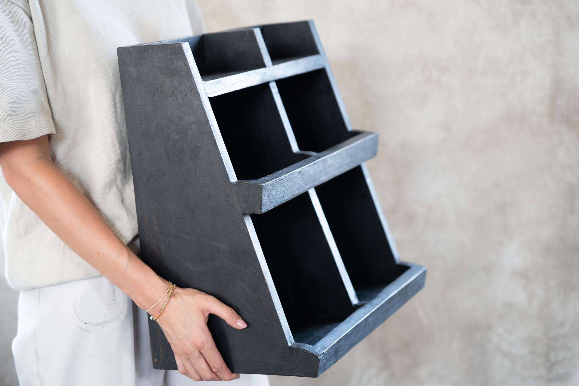 Deze gruttersbak in vintage zwart is een stoere én praktische opberger met een authentieke uitstraling. Het robuuste houten ontwerp, afgewerkt in een warme zwarte tint, brengt direct sfeer en karakter in je interieur.