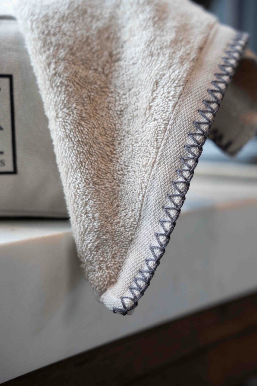 Deze handdoek in de kleur beige is een praktische en stijlvolle toevoeging aan je badkamer. Dit formaat is ideaal voor dagelijks gebruik na het wassen van je handen, gezicht of na het douchen. De rustige, neutrale kleur past goed bij verschillende interieurstijlen en combineert gemakkelijk met andere handdoeken en accessoires. De rand is afgewerkt met een subtiele sierlijke stikrand voor een nette uitstraling.