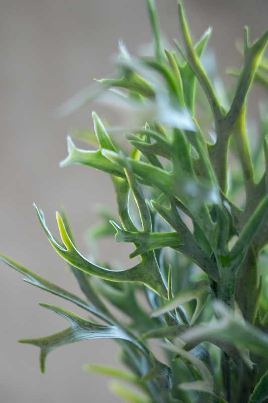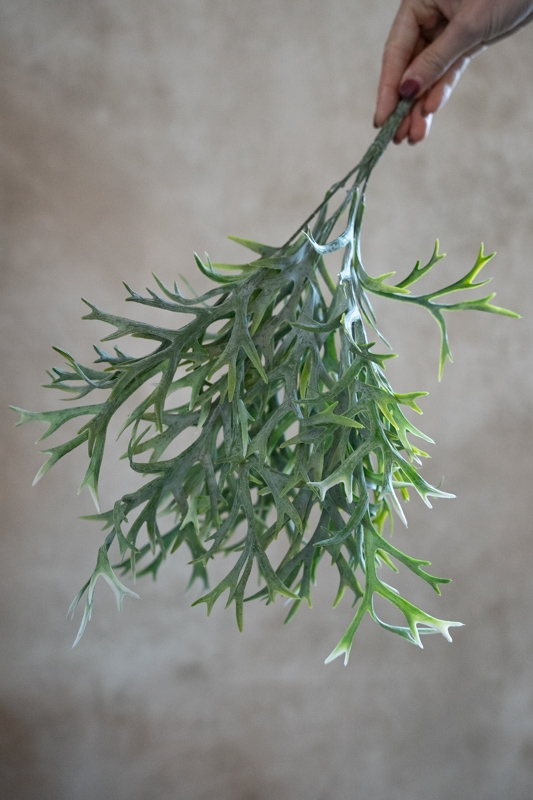 Dit elegante hertshoorn-takje van kunstgroen heeft een fijne, luchtige structuur en een natuurlijke grijsgroene tint. De ranke vertakkingen geven het geheel een verfijnde en rustige uitstraling, perfect passend binnen een sober, landelijk of botanisch interieur.