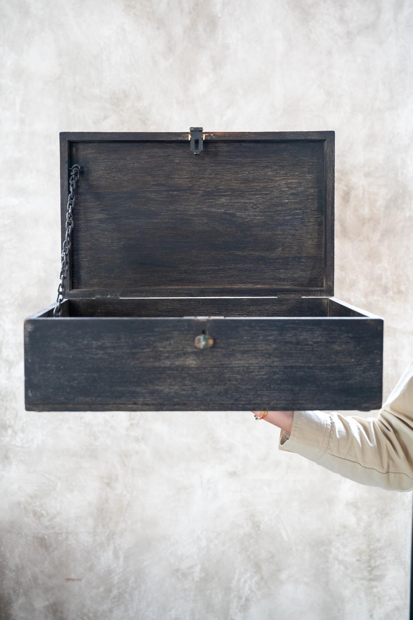 Gebruik hem om losse spulletjes een mooie plek te geven, als sfeervol detail op een kast of dressoir, of zelfs als klein opbergkoffertje voor brieven, kaarsen of andere schatten. De metalen sluiting en het fijne kettingdetail aan de binnenzijde geven de kist net dat beetje extra karakter.