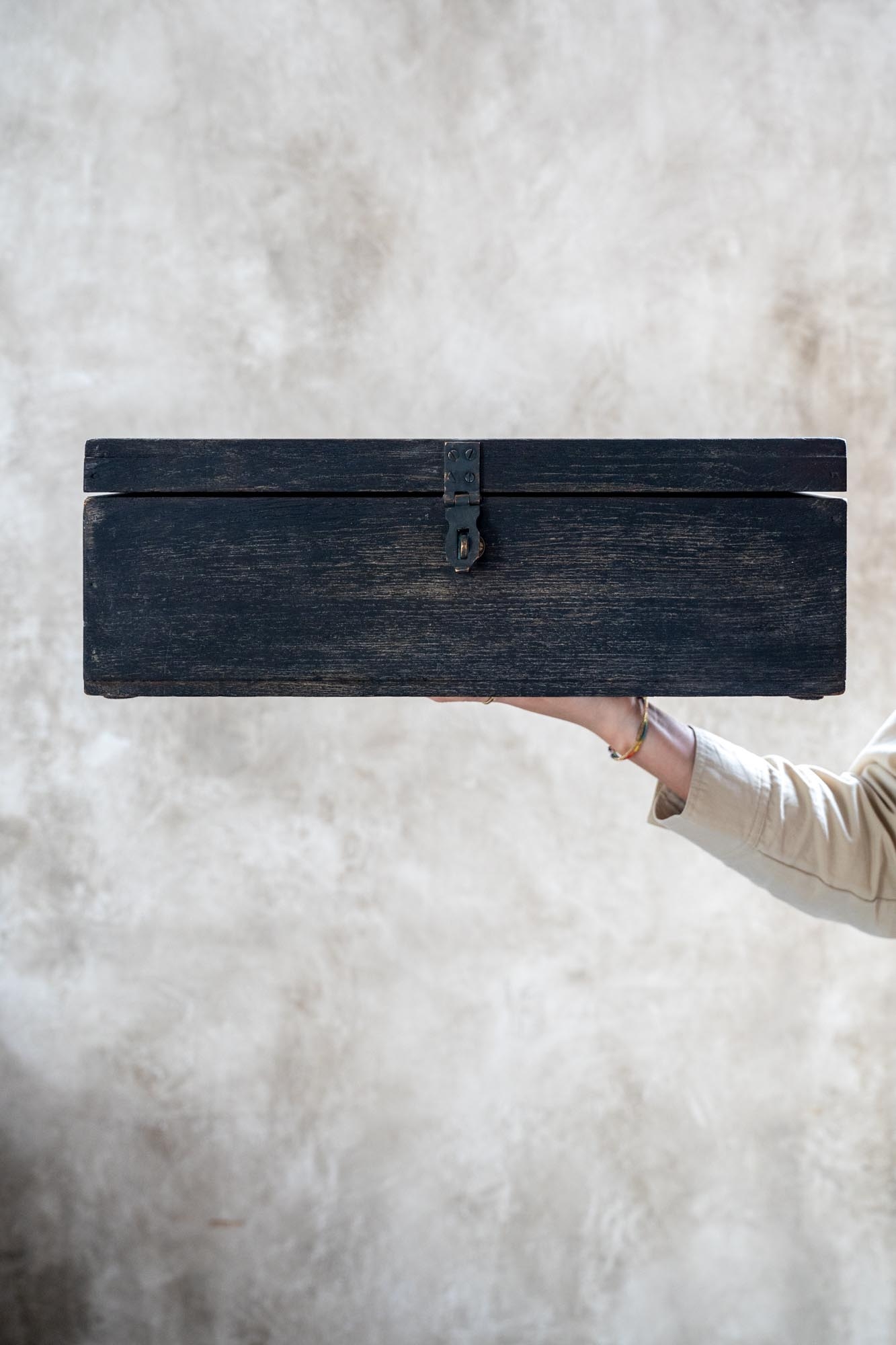 eze robuuste houten opbergkist in het zwart hout is zowel stoer als stijlvol. Met zijn rustieke uitstraling en subtiele verouderde afwerking, past hij perfect binnen een landelijk interieur.