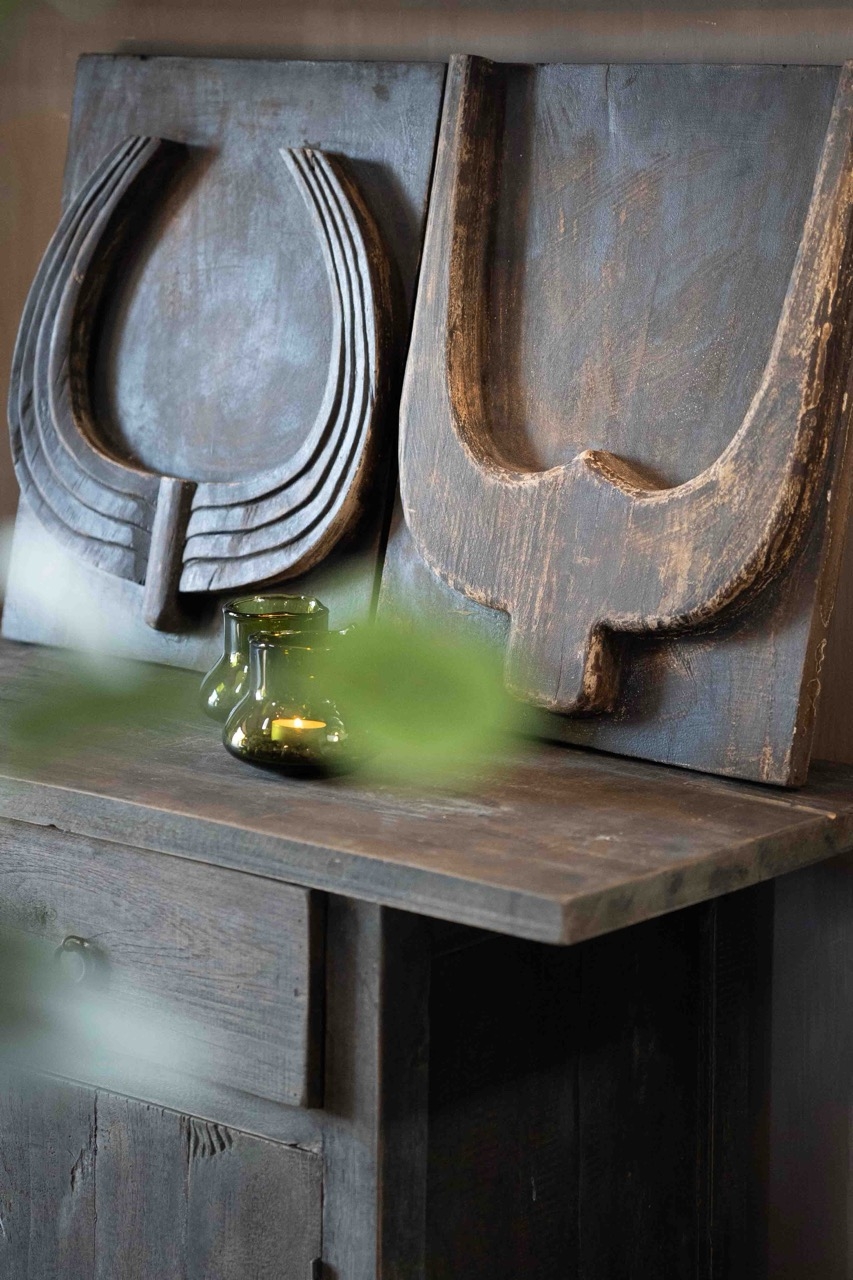Dit houten wandpaneel heeft een krachtige, symmetrische vorm met een uitgesneden boogstructuur. Door de verweerde afwerking en de donkere tinten krijgt het geheel een warme, doorleefde look die perfect past in een interieur met natuurlijke materialen zoals steen, hout en linnen.