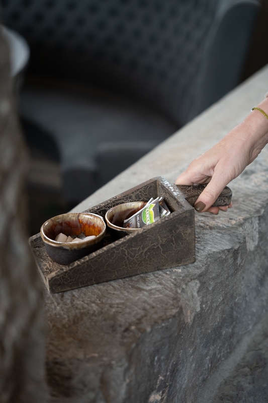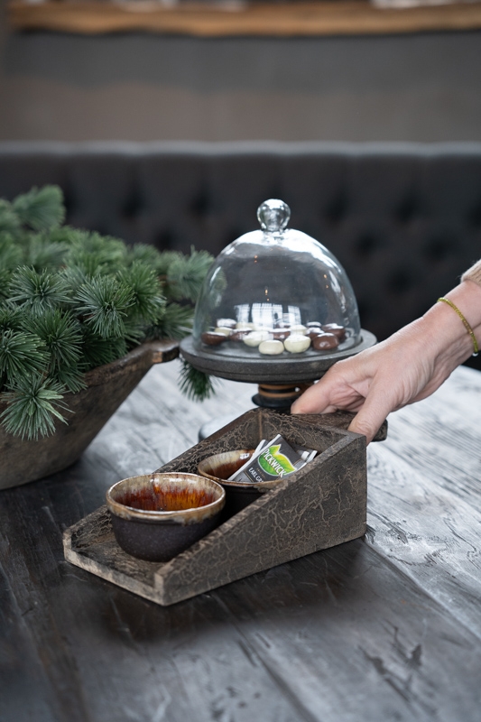 Dankzij de schuin oplopende vorm en het vlakke oppervlak is het ideaal om kleine items netjes te presenteren, zoals theezakjes, dipschaaltjes, snacks of andere decoratieve elementen. De donkerbruine houttint en het karakteristieke craquelé-effect maken het tot een subtiele blikvanger die goed combineert met aardewerk en natuurlijke materialen.