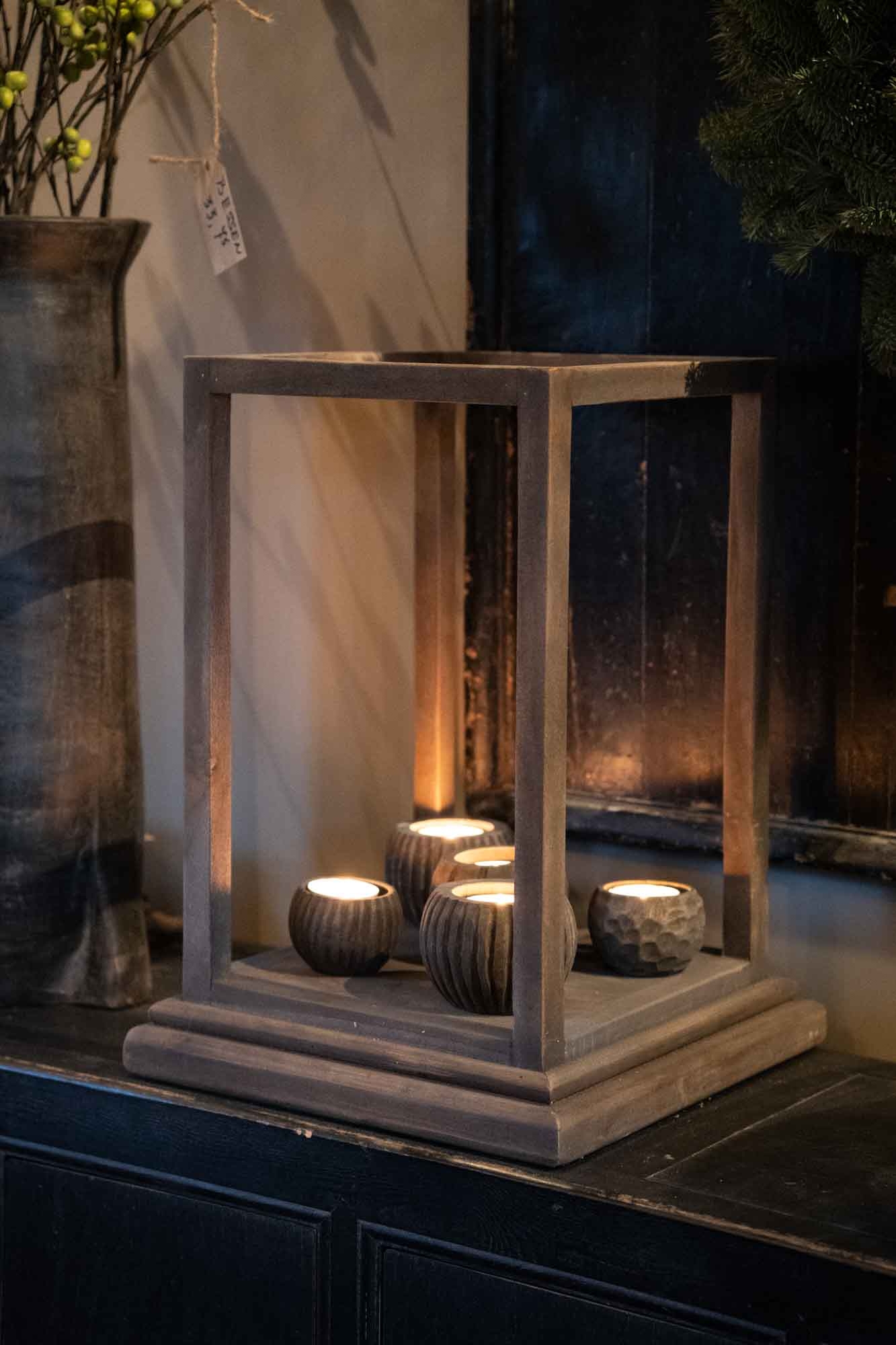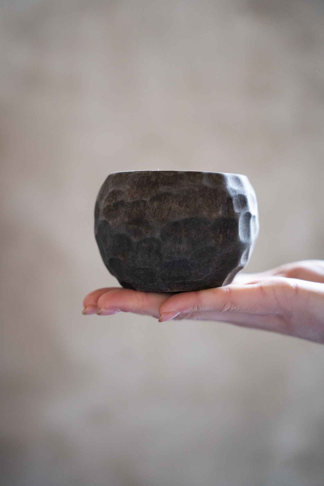 De Houten Theelichthouder Pebble heeft een robuuste, organische vorm met een licht onregelmatige structuur die doet denken aan natuurlijke stenen. De donkere houten afwerking geeft een rustige en tijdloze uitstraling, waardoor deze houder makkelijk combineert met verschillende interieurs.