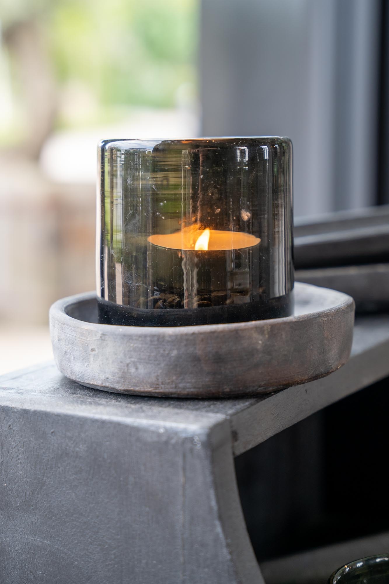 Ronde stenen Aura Peeperkorn onderzetter met een stoere, donkere afwerking. Ideaal om een windlicht, theelicht of klein vaasje op te plaatsen.