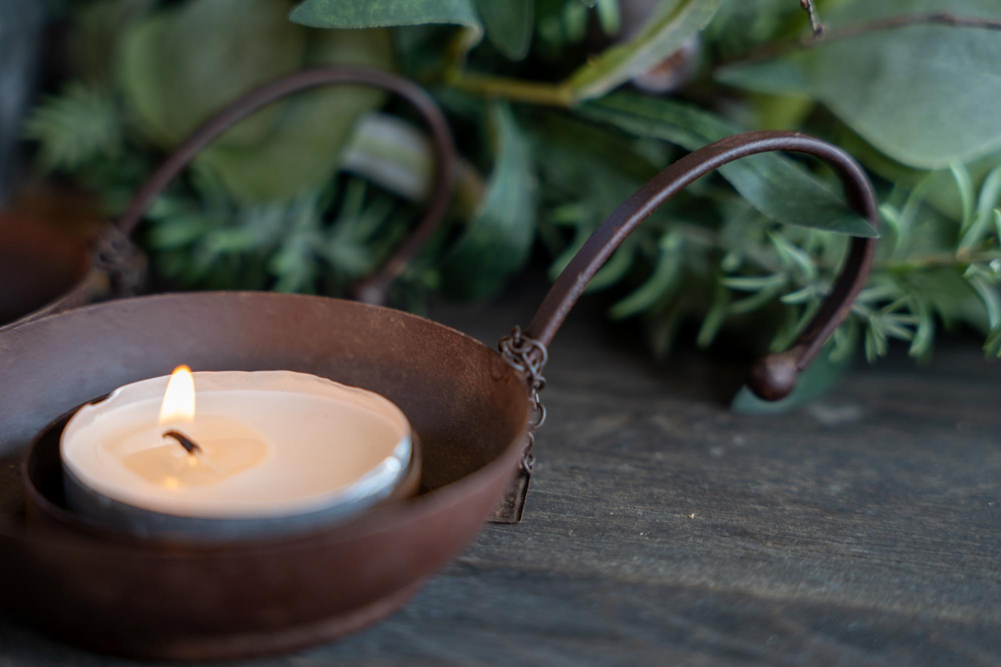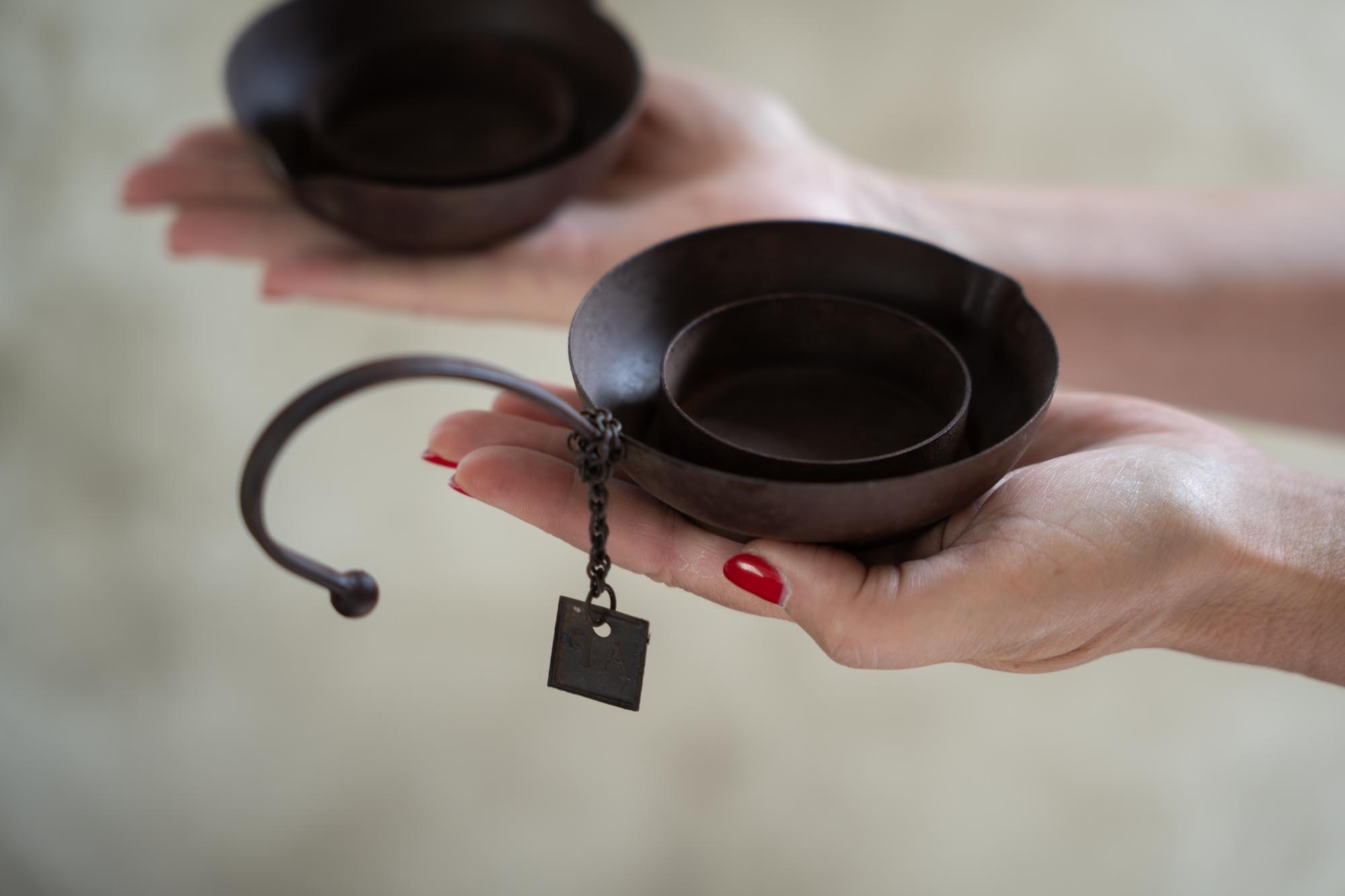 Deze metalen kaarsenhouder van Aura Peeperkorn heeft een stoere, authentieke uitstraling dankzij de donkere roetkleur en het doorleefde karakter. Het ronde schaaltje biedt ruimte voor een stompkaars of theelicht, terwijl de sierlijke handgreep met kettinkje zorgt voor een charmant detail.