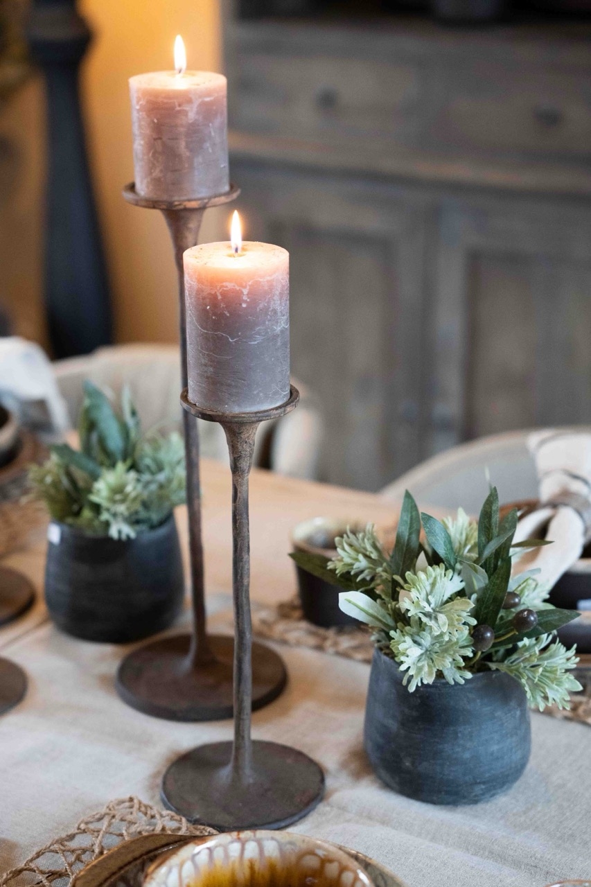 Kandelaar Floris is een metalen kandelaar met een slanke vorm en een robuuste, doorleefde afwerking. De kandelaar heeft een rustige uitstraling en past goed in een landelijk, sober of industrieel interieur. Door de smalle voet en de rechte lijn oogt het model verfijnd, terwijl het materiaal zorgt voor een stoer karakter.