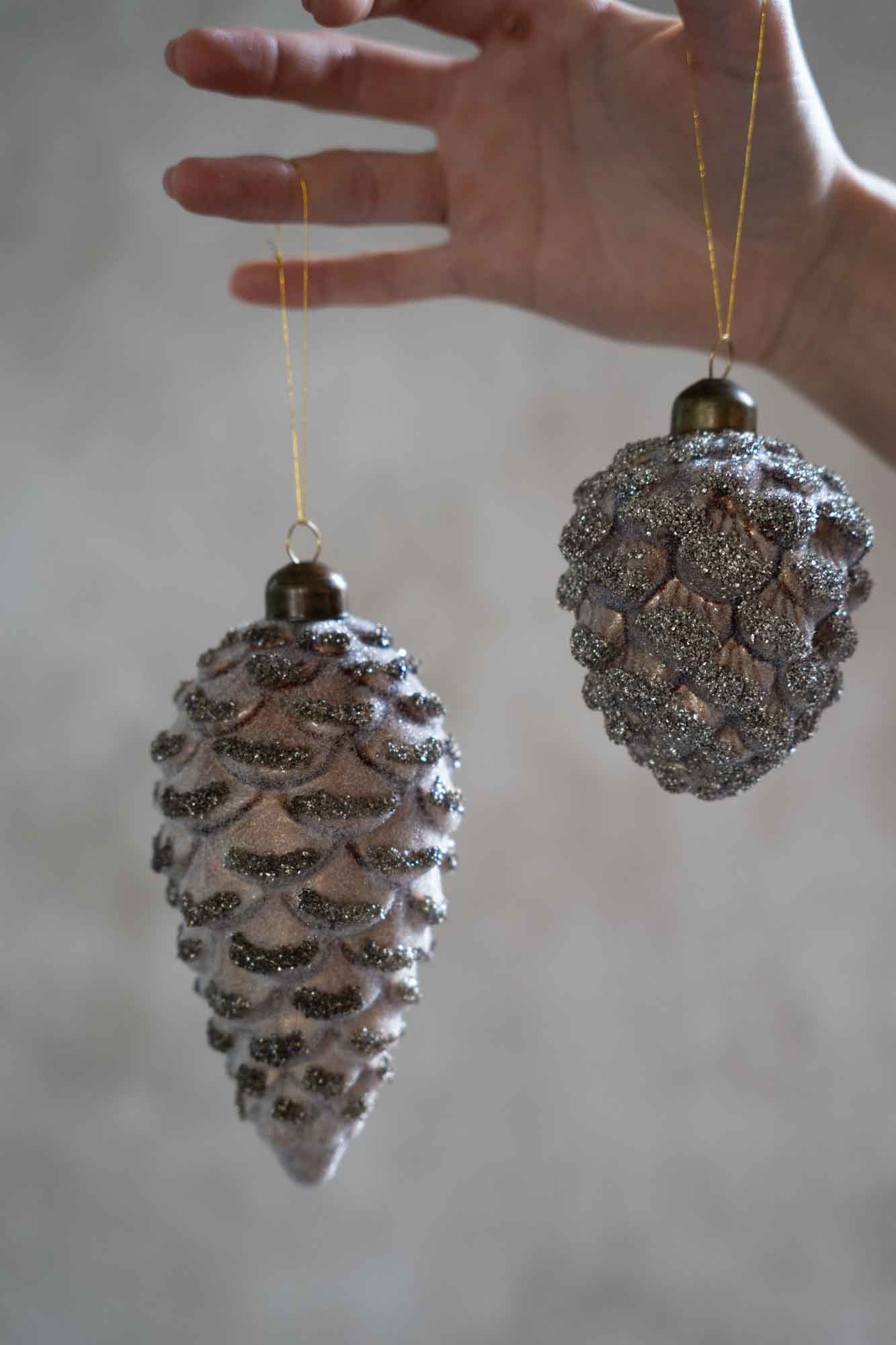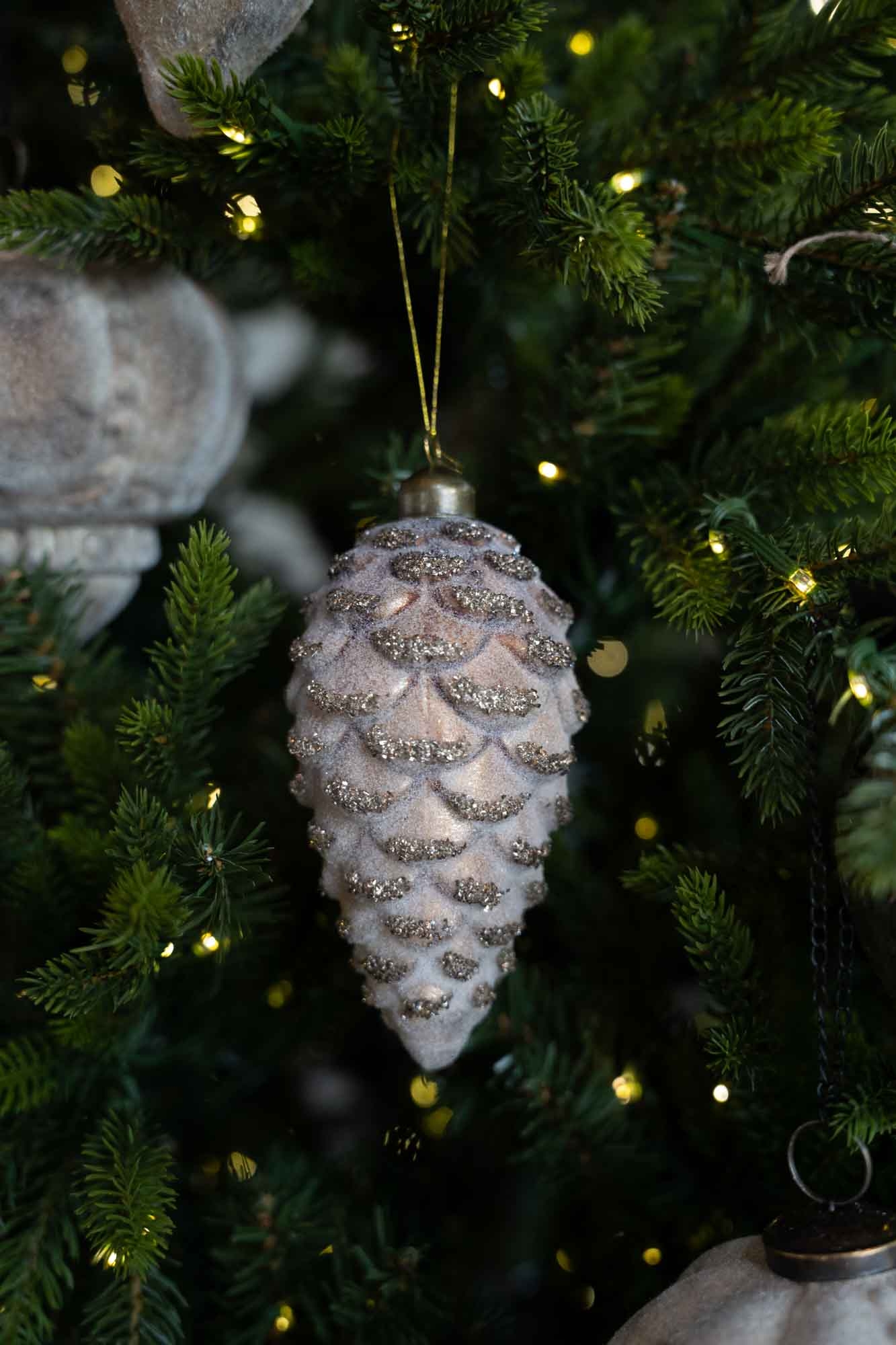 Deze kerstbal brengt een warme, natuurlijke sfeer in huis met een feestelijke glans. De dennenappelvorm en subtiele glitterlaag geven deze kerstbal een elegante, winterse uitstraling. Mooi te combineren met groen, hout en andere natuurlijke tinten voor een stijlvol geheel.