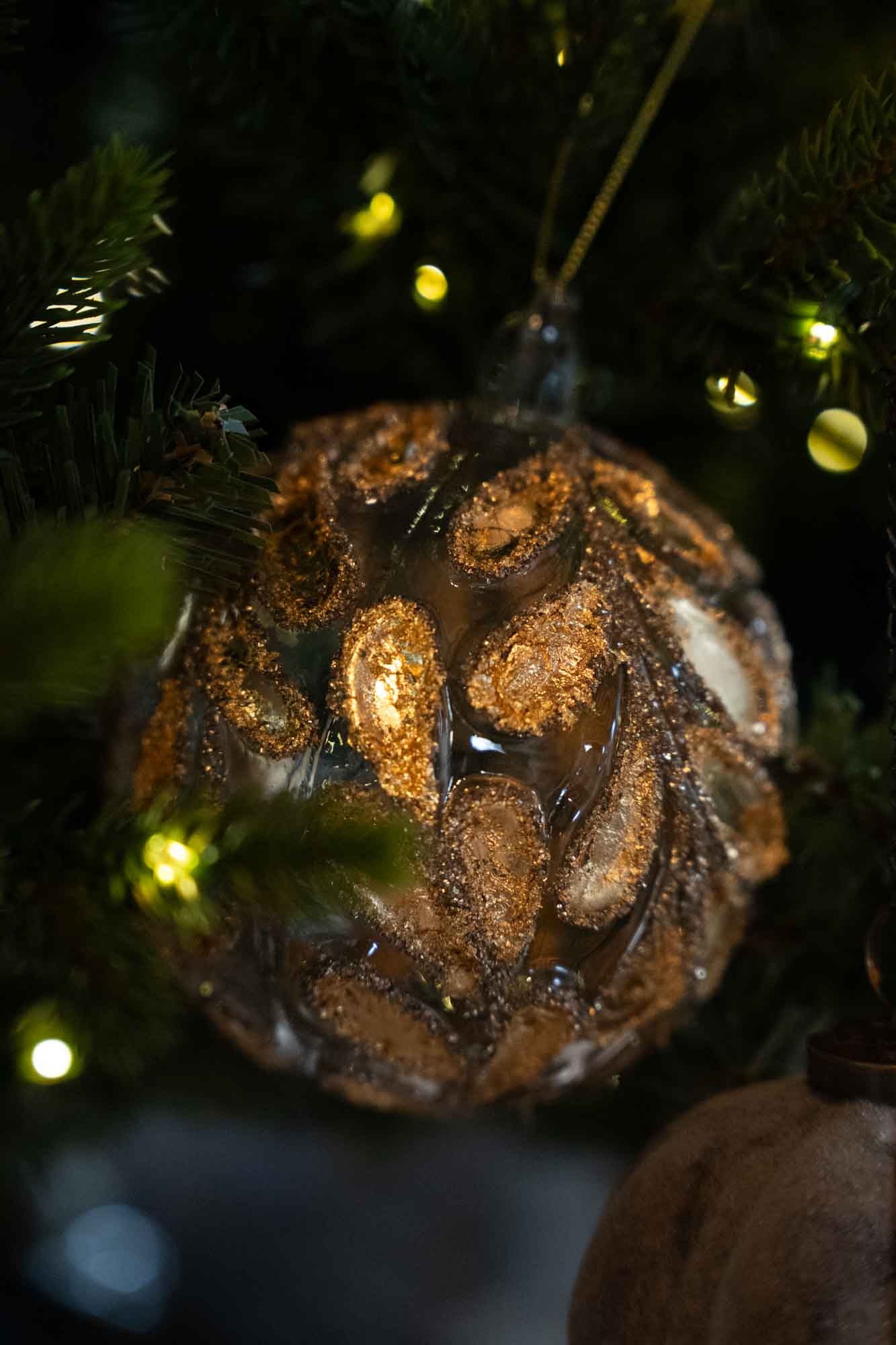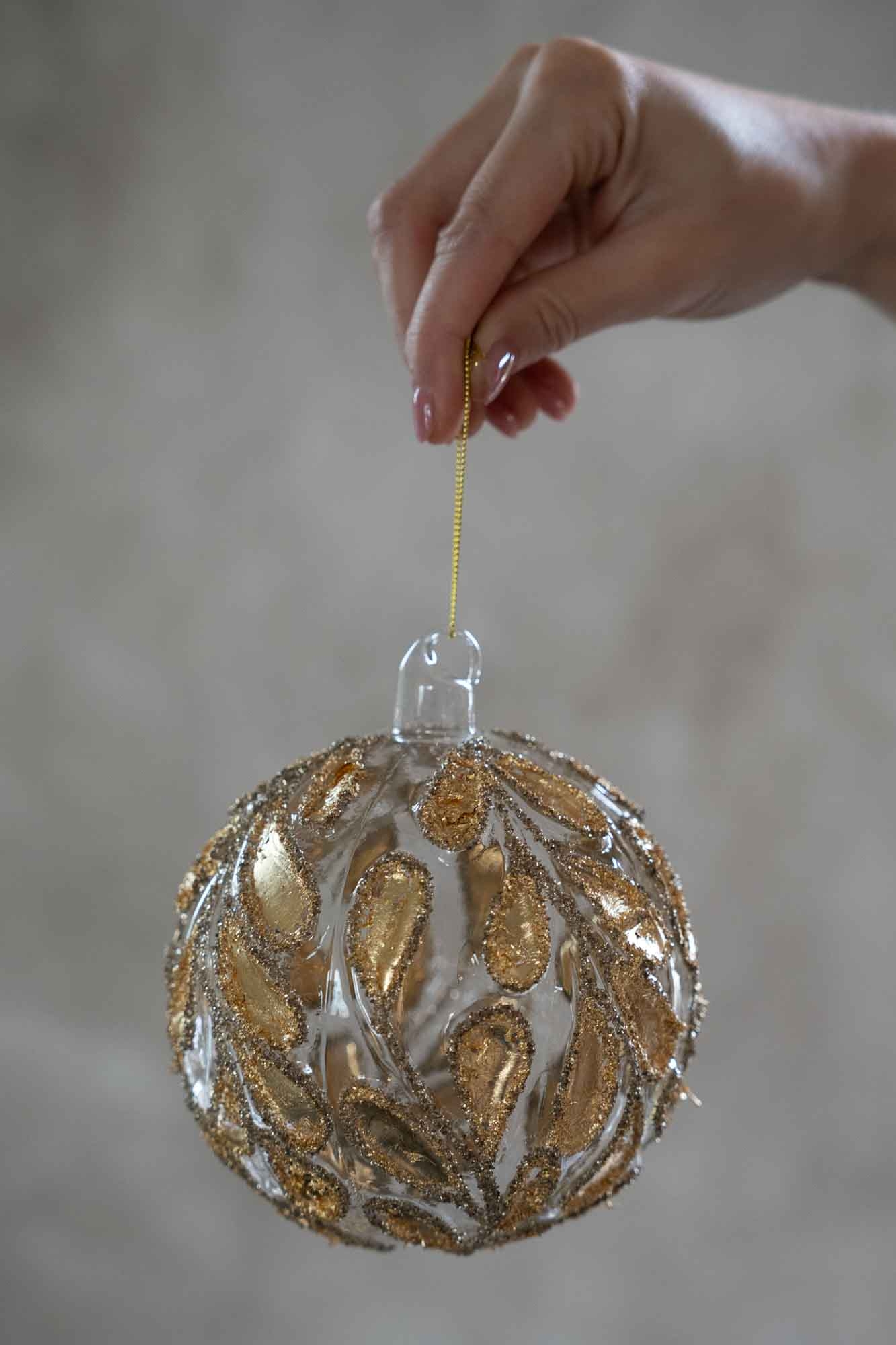 Kerstbal Goud - Amber Glow straalt warmte en luxe uit. De glazen bal is rijk gedecoreerd met een reliëfpatroon van bladachtige vormen, afgewerkt met een glanzende gouden tint en subtiele glitteraccenten. Door het warme licht van de kerstboom komt de amberkleurige gloed prachtig tot leven, wat zorgt voor een rijke, sfeervolle uitstraling. Perfect voor een klassieke, chique kerststijl , combineer met natuurlijke materialen voor een extra elegant effect.