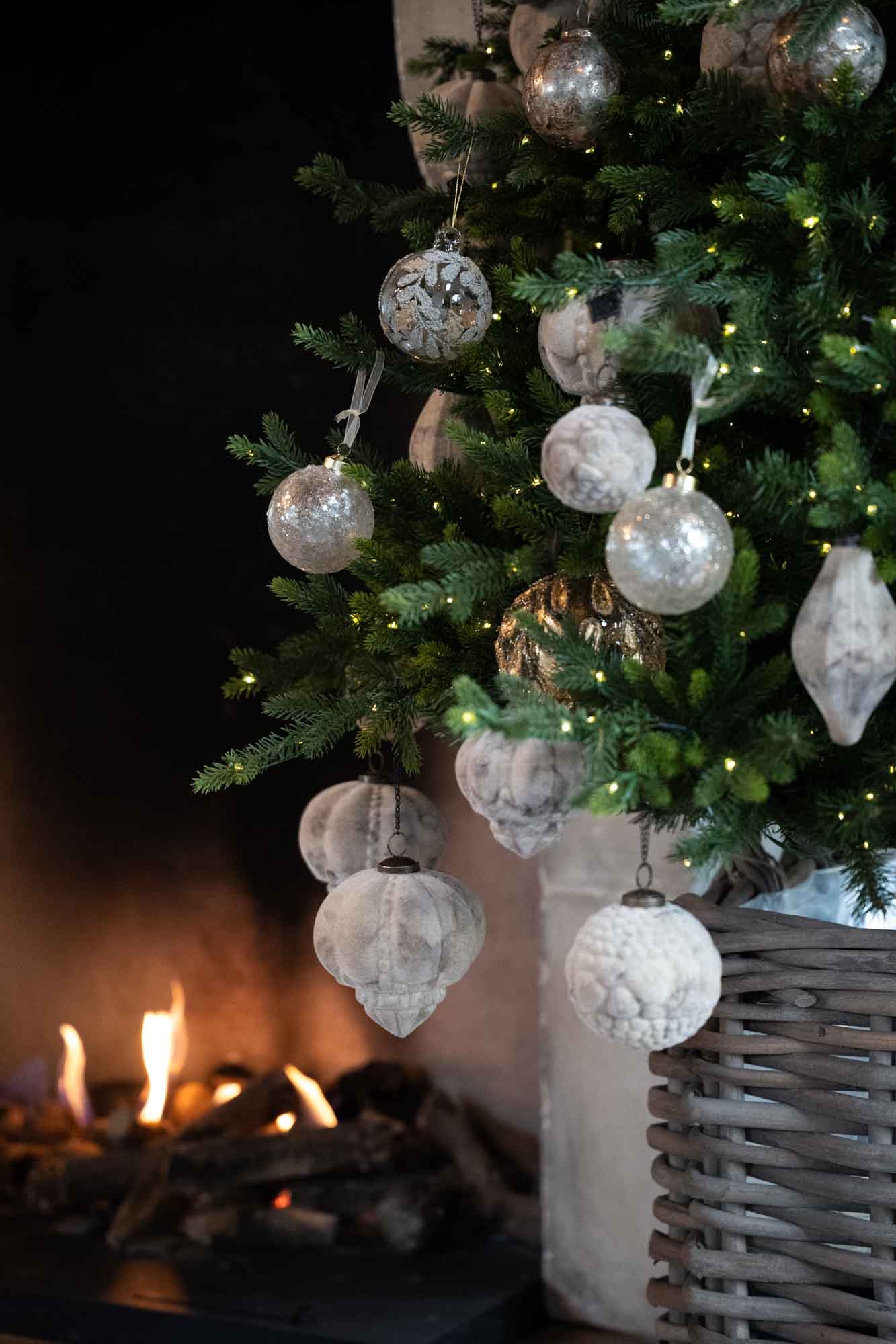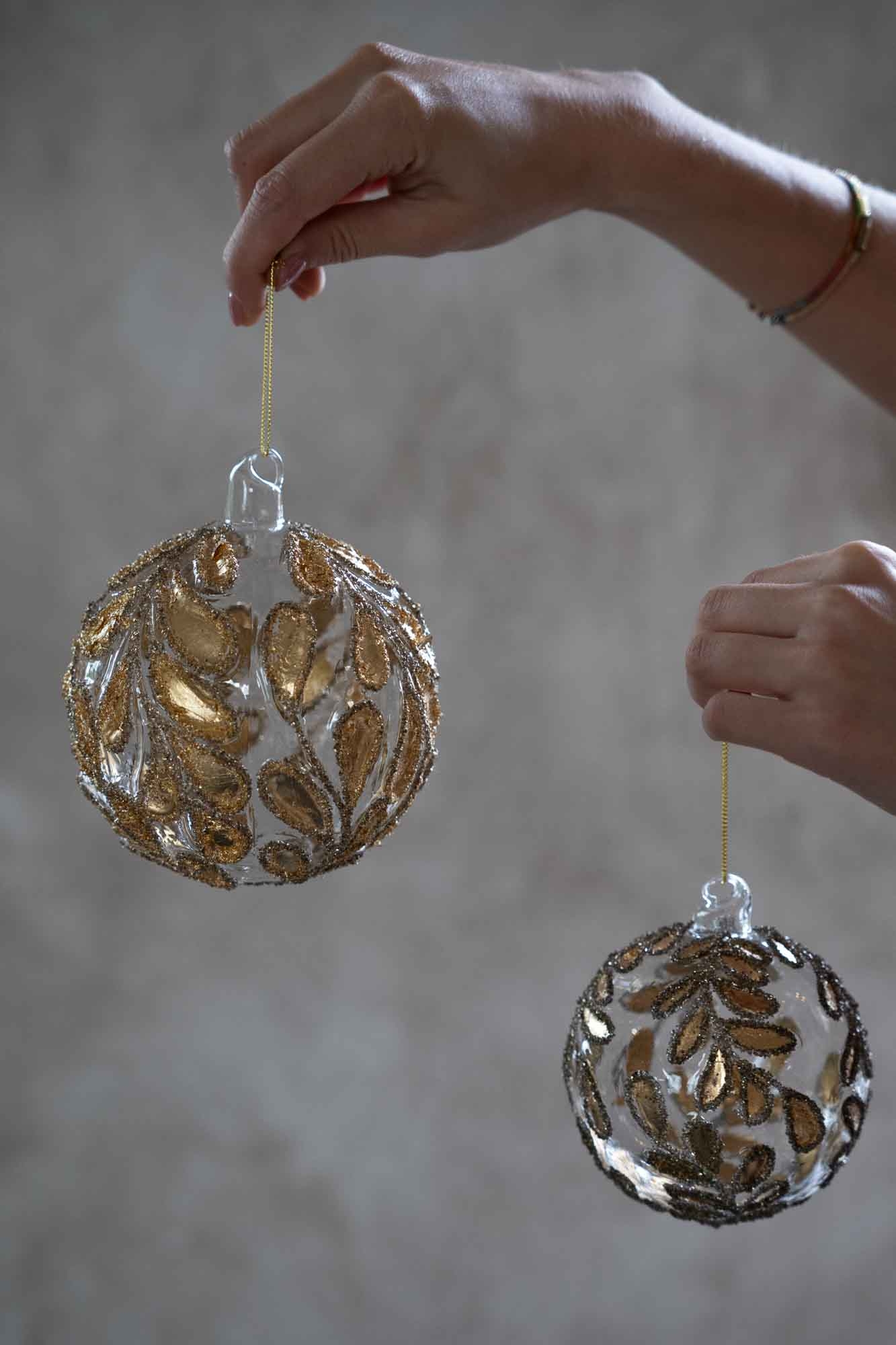 Kerstbal Goud - Amber Glow straalt warmte en luxe uit. De glazen bal is rijk gedecoreerd met een reliëfpatroon van bladachtige vormen, afgewerkt met een glanzende gouden tint en subtiele glitteraccenten. Door het warme licht van de kerstboom komt de amberkleurige gloed prachtig tot leven, wat zorgt voor een rijke, sfeervolle uitstraling. Perfect voor een klassieke, chique kerststijl , combineer met natuurlijke materialen voor een extra elegant effect.