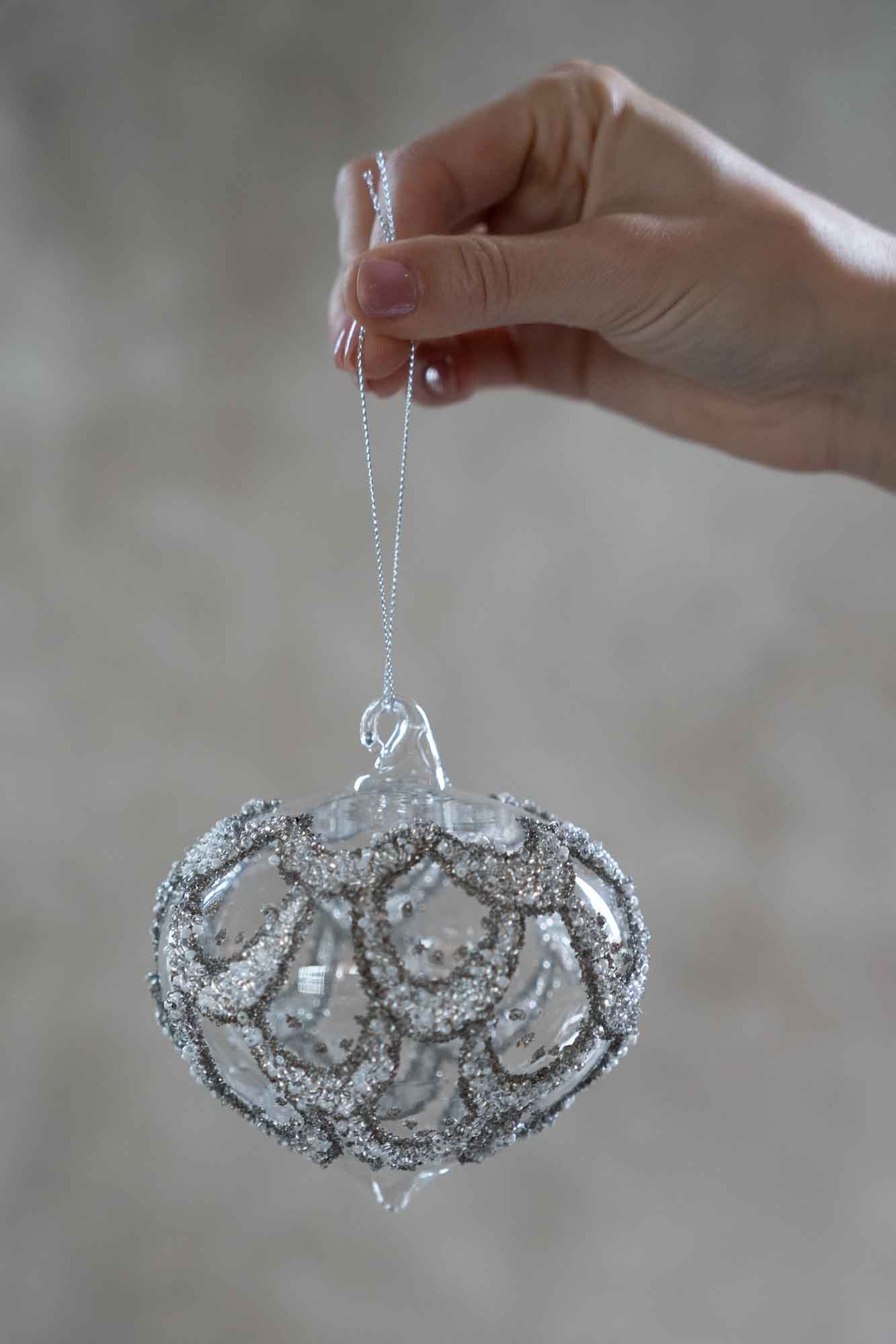 een verfijnd ornament dat elegantie en schittering combineert. De glazen bal heeft een unieke vorm en is versierd met een sierlijk patroon van zilverkleurige glitters en kleine kraaltjes, wat zorgt voor een luxueuze uitstraling. Wanneer het licht erop valt, glinstert hij op een subtiele, feestelijke manier.