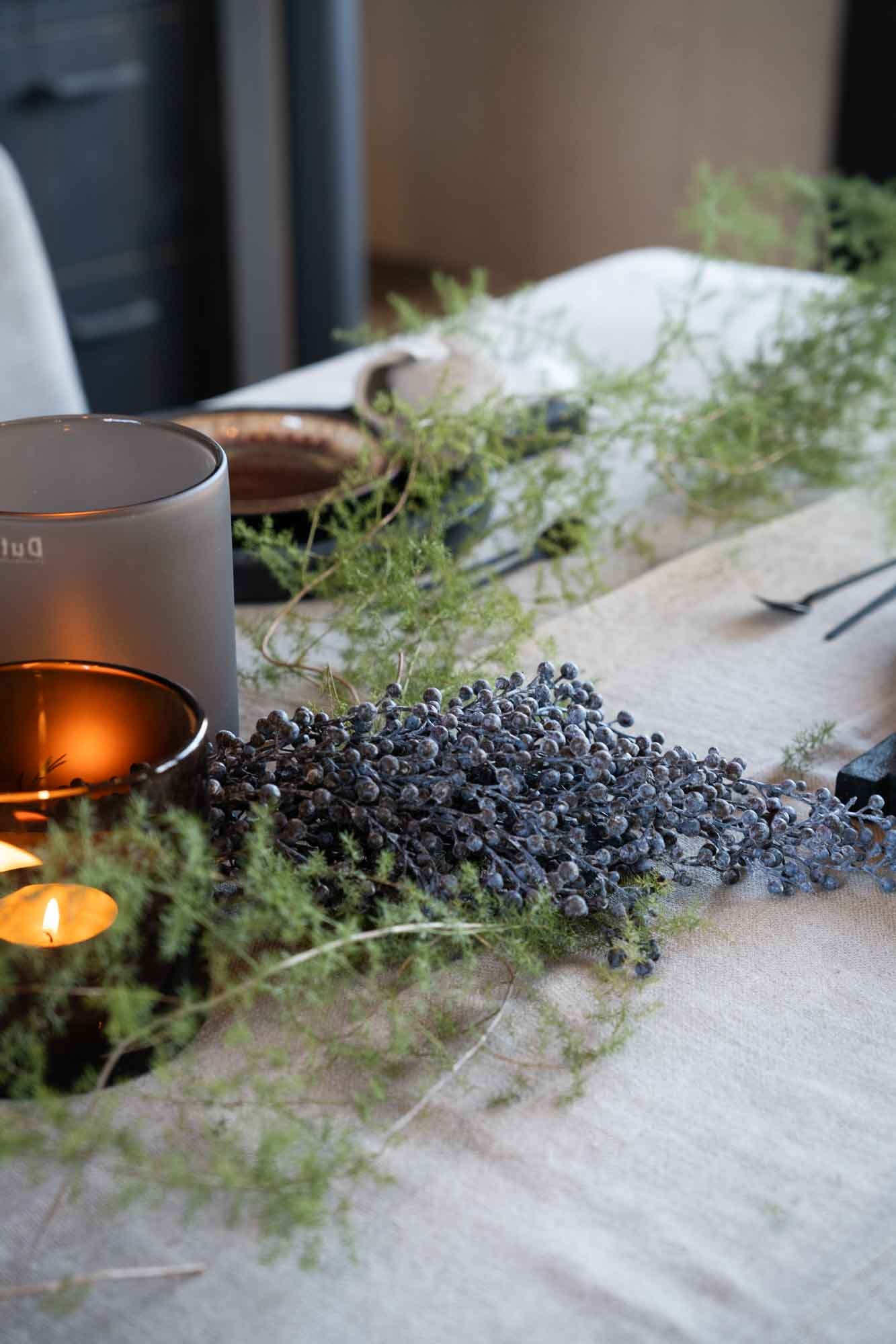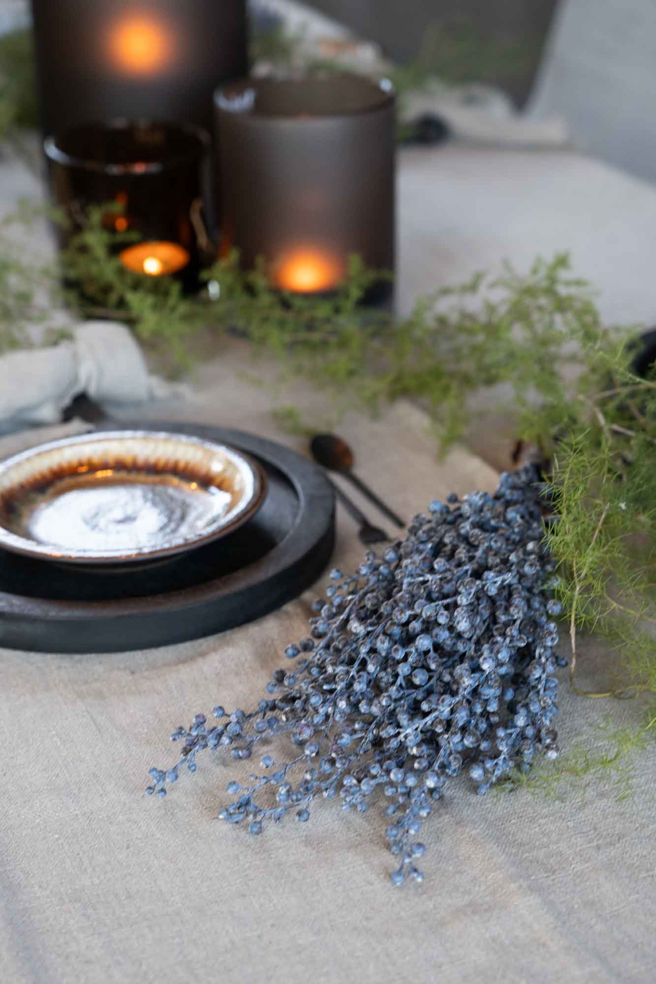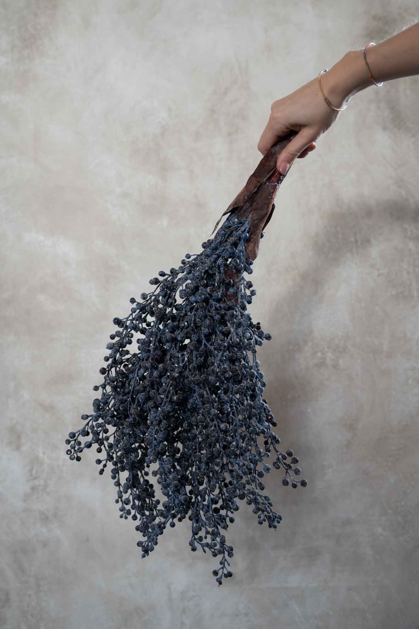 De blauw/bruine kunst dadeltak heeft een diepe, doorleefde kleur die perfect past bij de warme, sobere stijl van het seizoen. Zijn rijke tinten en natuurlijke uitstraling maken hem ideaal om los neer te leggen, te stylen op een schaal of te verweven tussen kaarsen en windlichten.