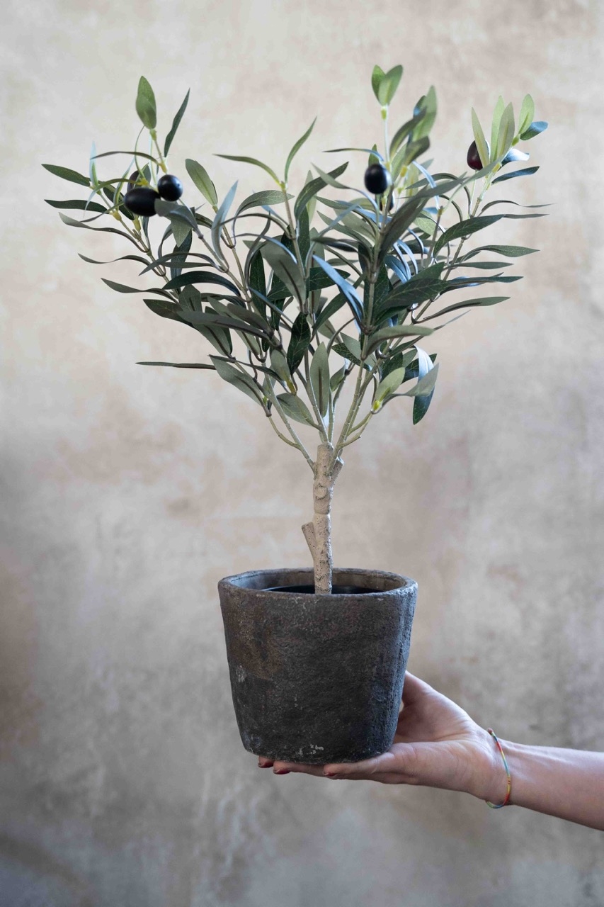 Dit kunst olijfboompje staat in een stoer, rustiek potje en vormt samen één stijlvol geheel. De groene blaadjes en donkere olijfjes zorgen voor een natuurlijke uitstraling, terwijl de pot een robuuste touch geeft.