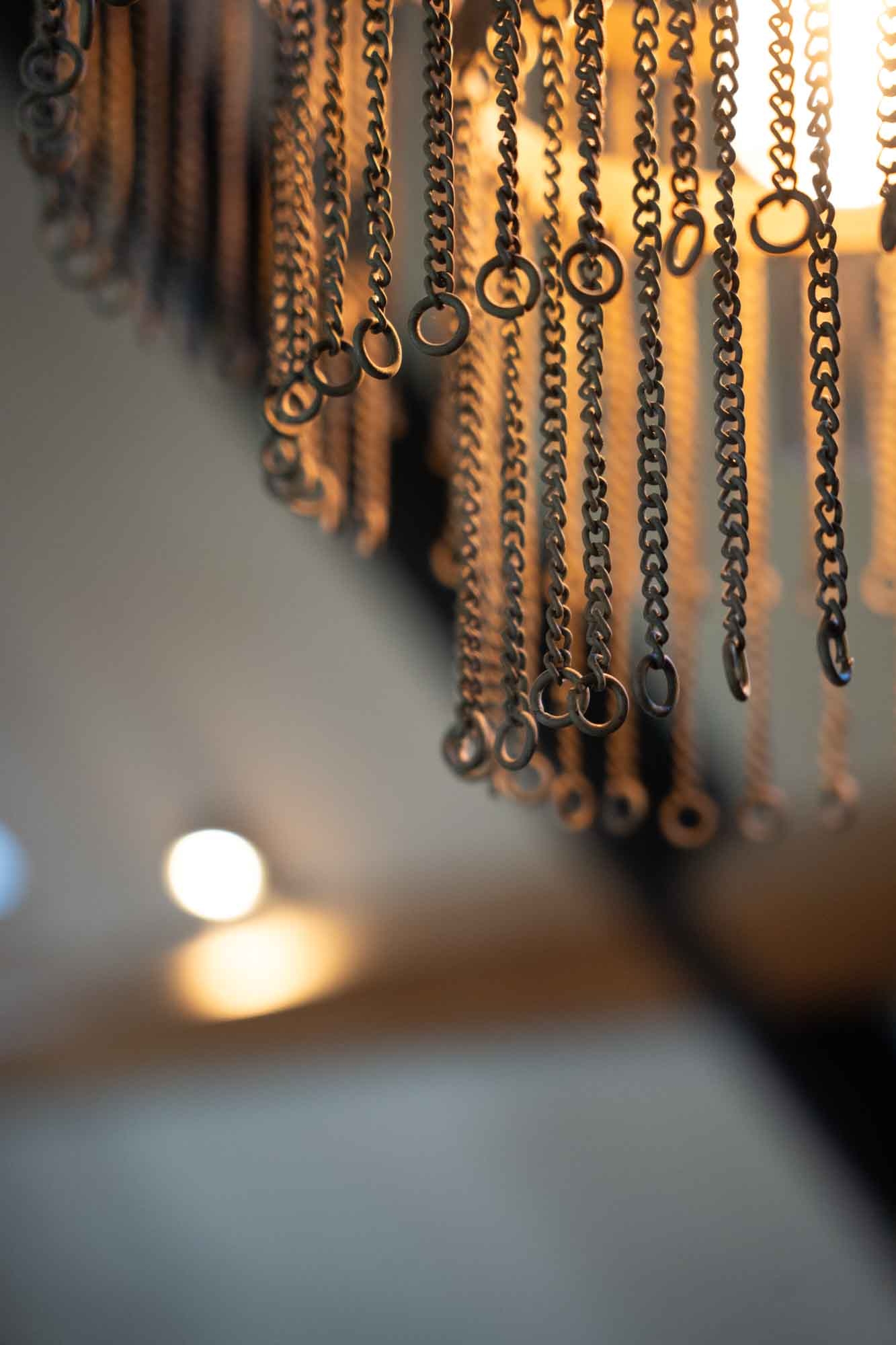 De Kaia is een verfijnde kroonluchter met een stoere rand. De vele metalen kettingen vormen een speels en elegant geheel dat het licht zacht filtert, waardoor een warme en sfeervolle gloed ontstaat.