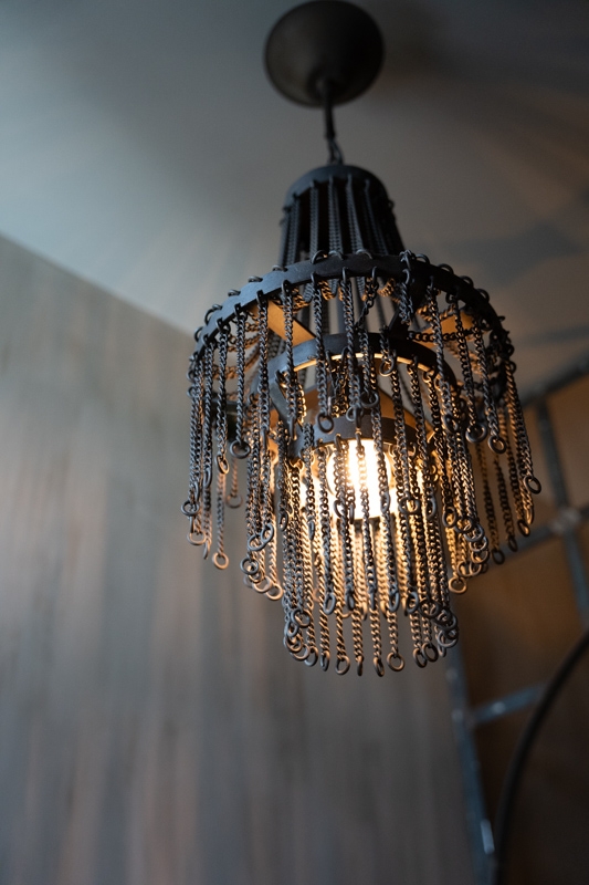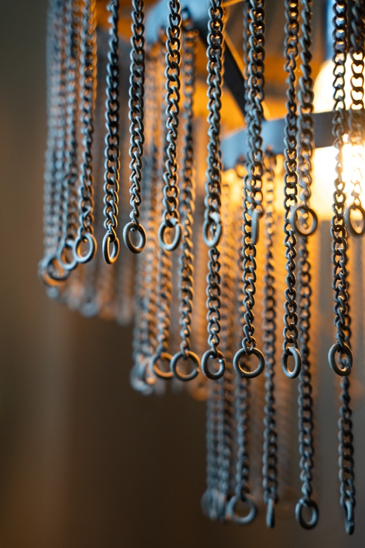 De Kaia is een verfijnde kroonluchter met een stoere rand. De vele metalen kettingen vormen een speels en elegant geheel dat het licht zacht filtert, waardoor een warme en sfeervolle gloed ontstaat.