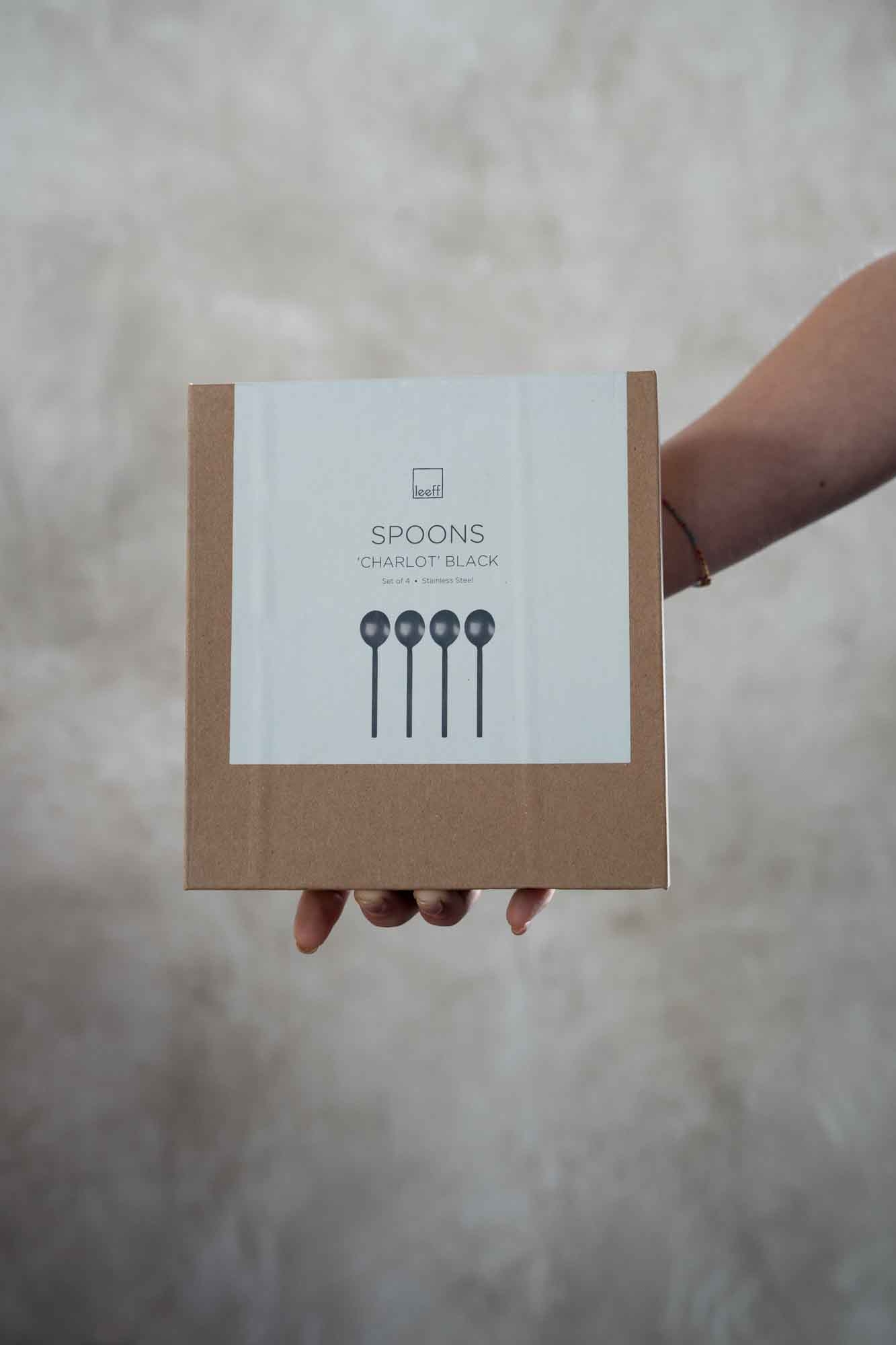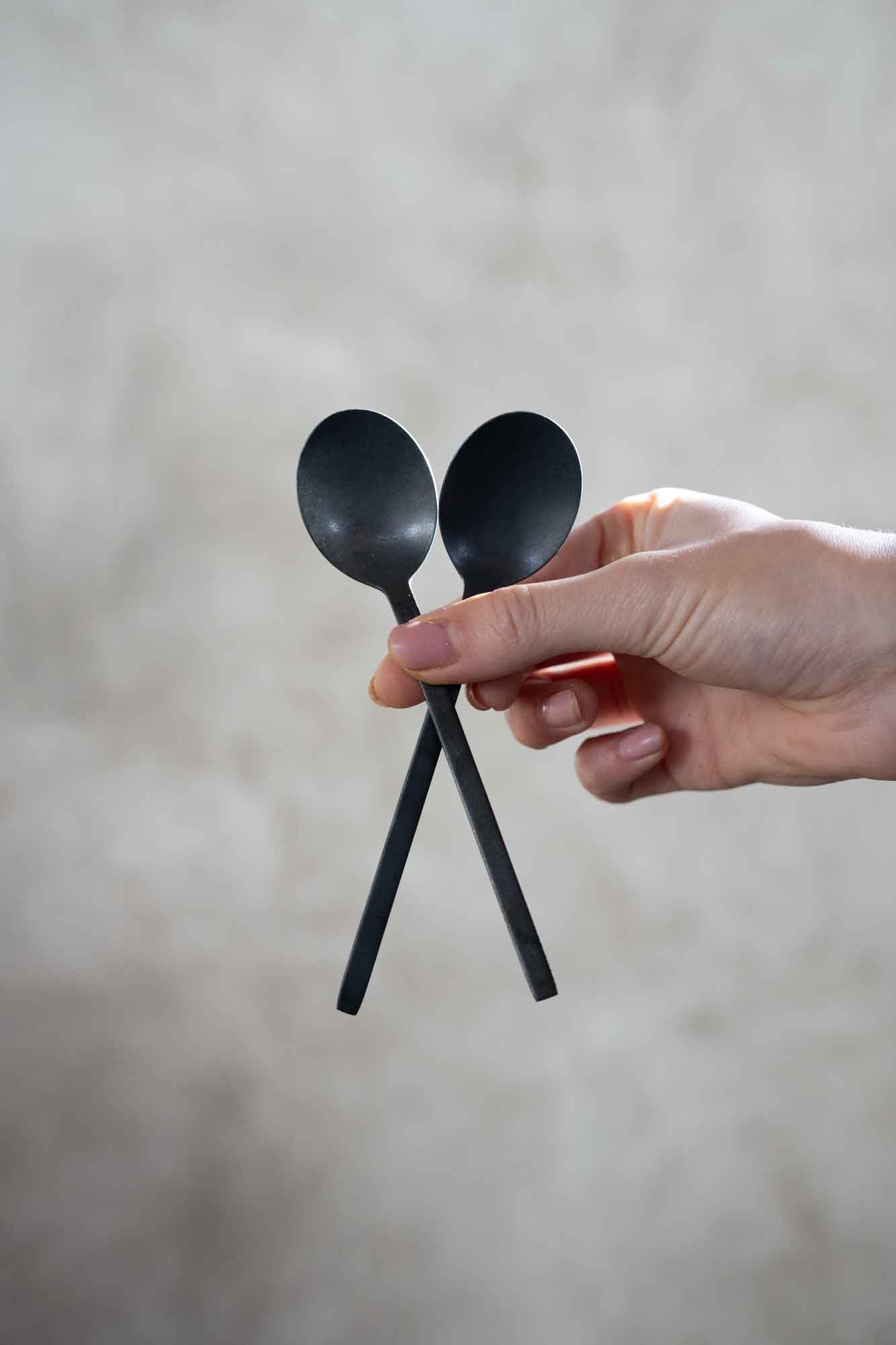 Een stijlvolle set van vier matzwarte lepels met een verfijnde, minimalistische vorm. De Lepelset combineert strak design met een ambachtelijke uitstraling. Gemaakt van hoogwaardig roestvrij staal met een matte afwerking die zacht aanvoelt en perfect past bij een modern of tijdloos gedekte tafel.