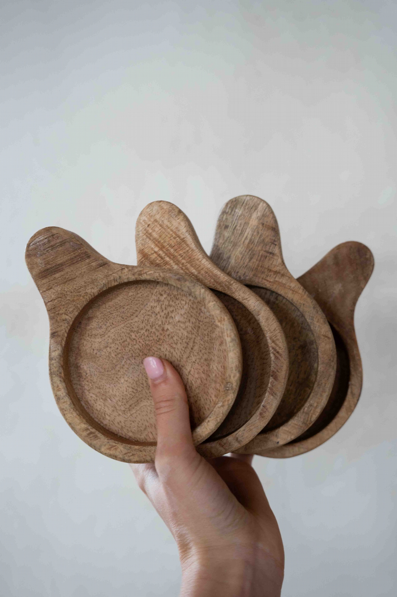 Deze houten onderzettertjes zijn een stijlvolle en praktische toevoeging aan elke tafelsetting. Gemaakt van natuurlijk hout en uitgevoerd in een organische, tijdloze vorm, zorgen ze voor een warme en rustige uitstraling.