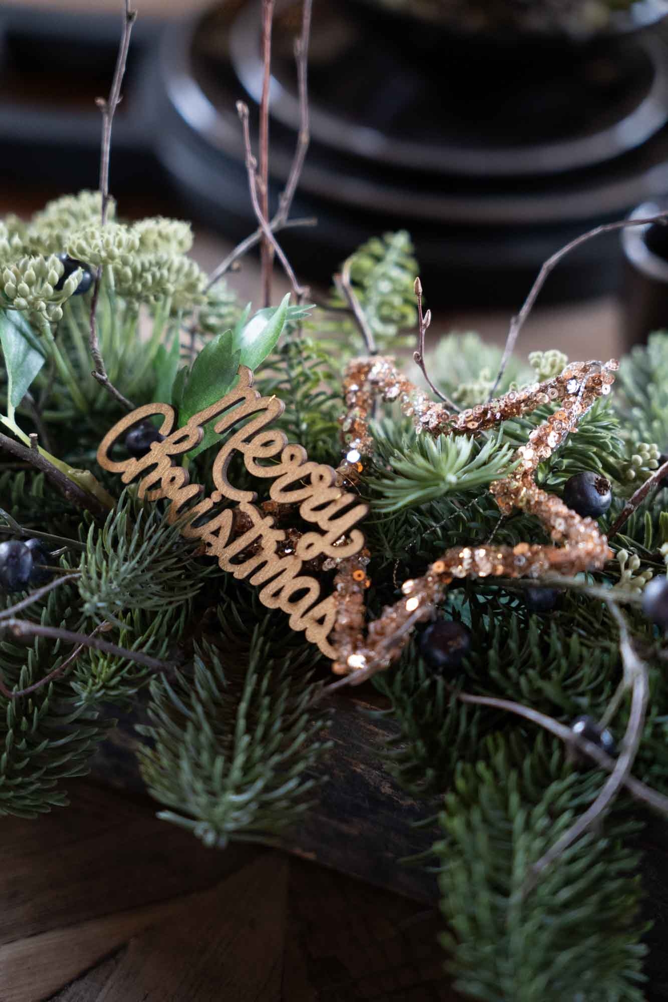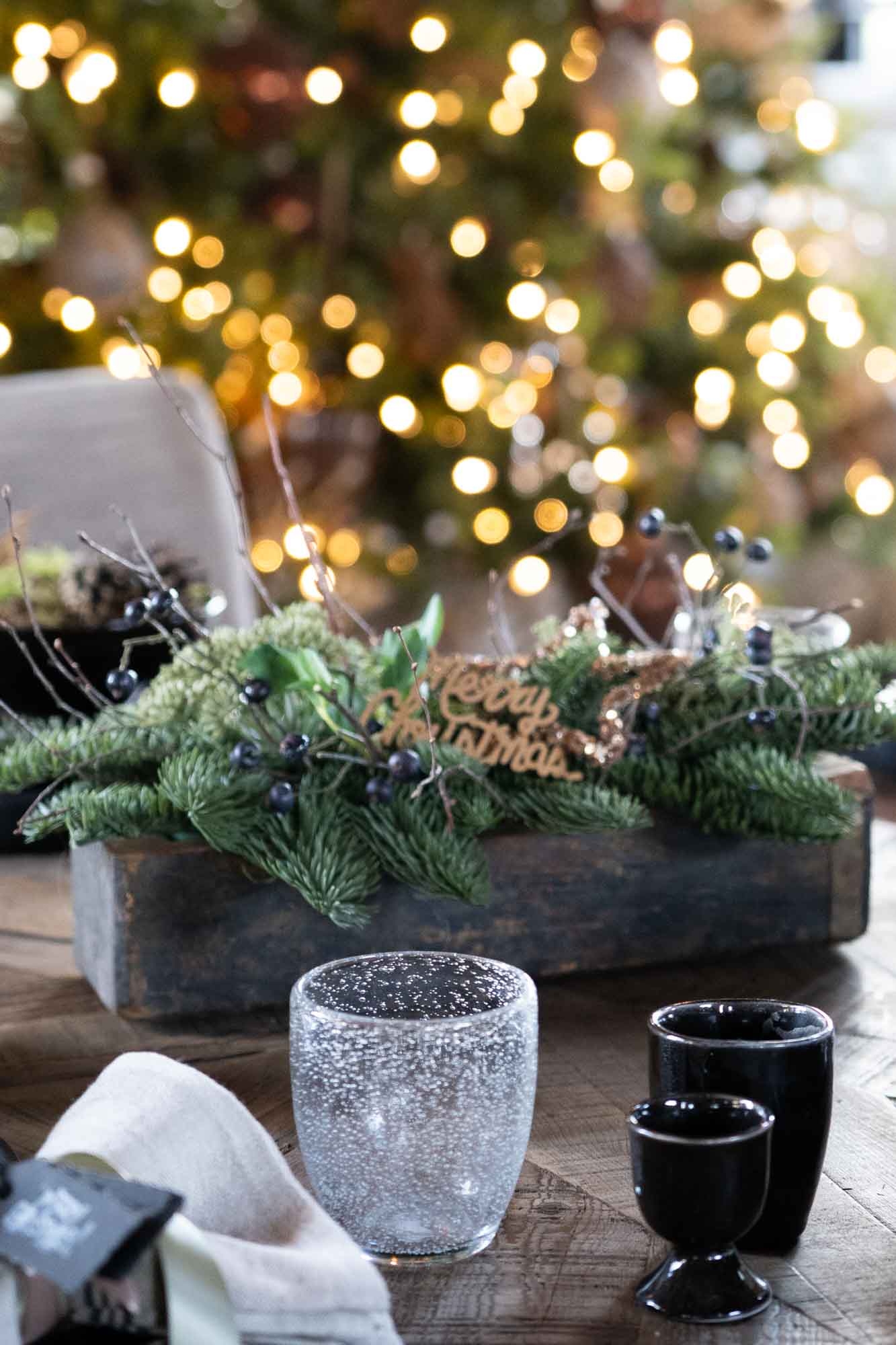 Bakje Nina straalt pure kerstsfeer en natuurlijke elegantie uit. Het rustieke houten bakje is opgemaakt met nobilis, donkerblauwe bessen, takjes en sprankelende details zoals een glitterster en een “Merry Christmas”-ornament. De combinatie van natuurlijke materialen en feestelijke accenten maakt Nina een prachtige blikvanger voor tafel, kast of vensterbank.