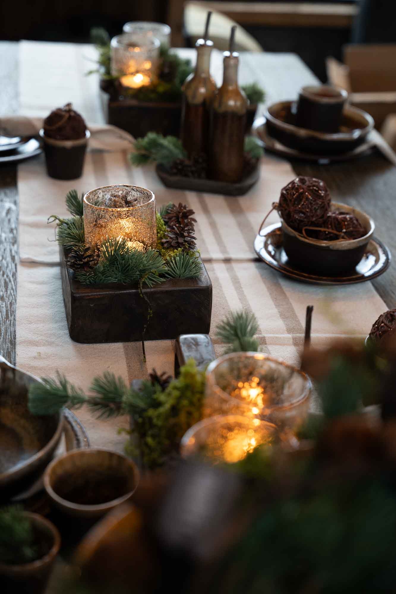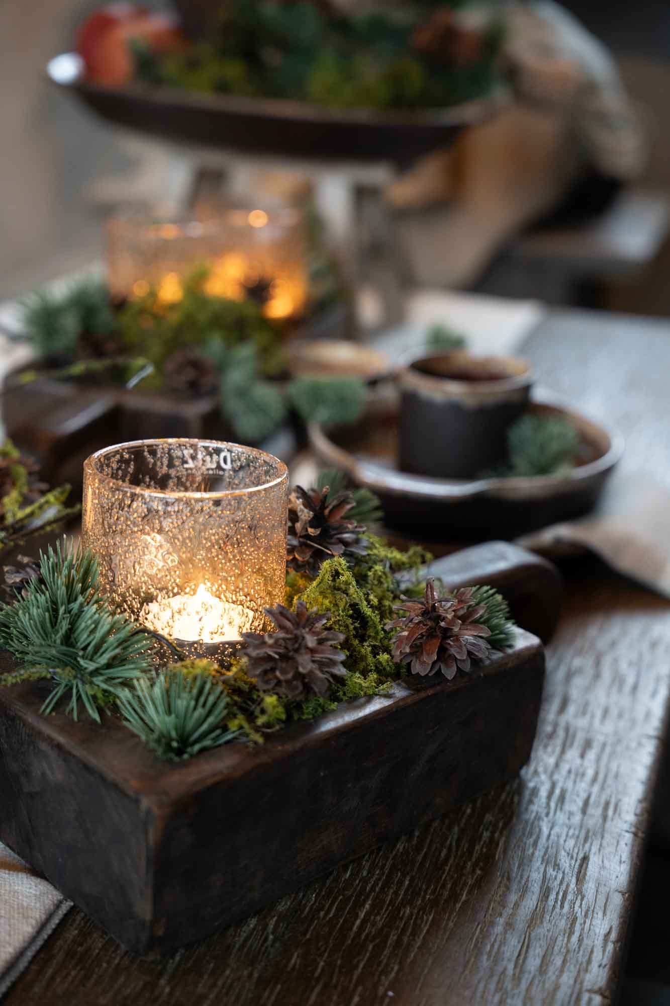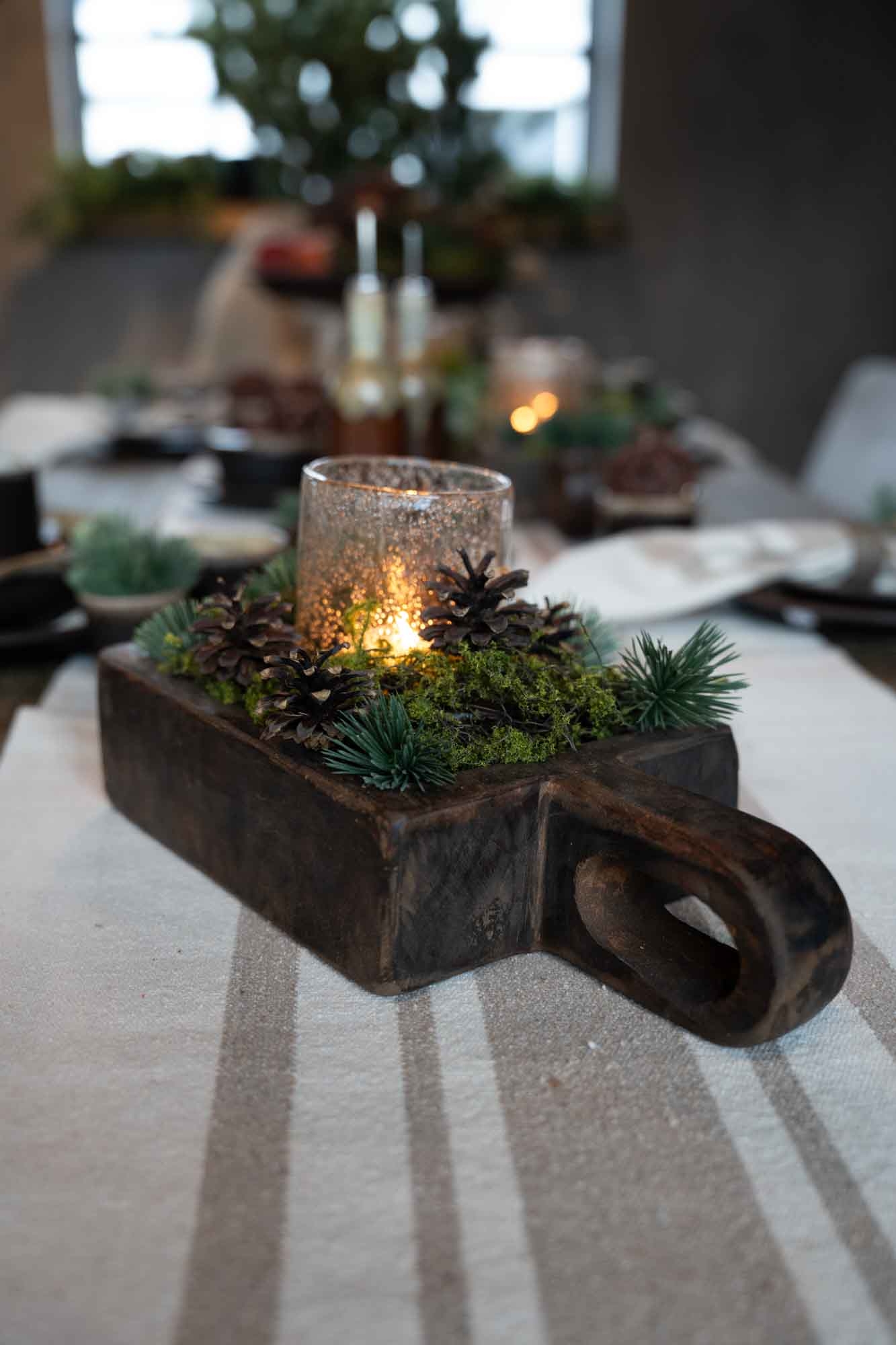 De Complete Set Schaal Pleun is een sfeervolle, opgemaakte schaal met een stoere, natuurlijke uitstraling. De houten schaal met hendel is gevuld met mos, dennegroen en kleine dennenappels, wat zorgt voor een warm en winters geheel. In het midden staat een theelichthouder met glas, die zacht licht verspreidt en de set een warme gloed geeft.