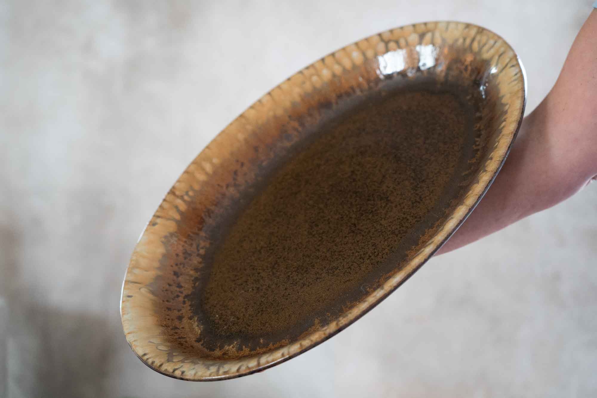 Deze ovale schaal is een echte blikvanger op tafel. Het glazuur toont diepe bruine tinten die richting de rand overgaan in warme, lichtere schakeringen met een levendig patroon.