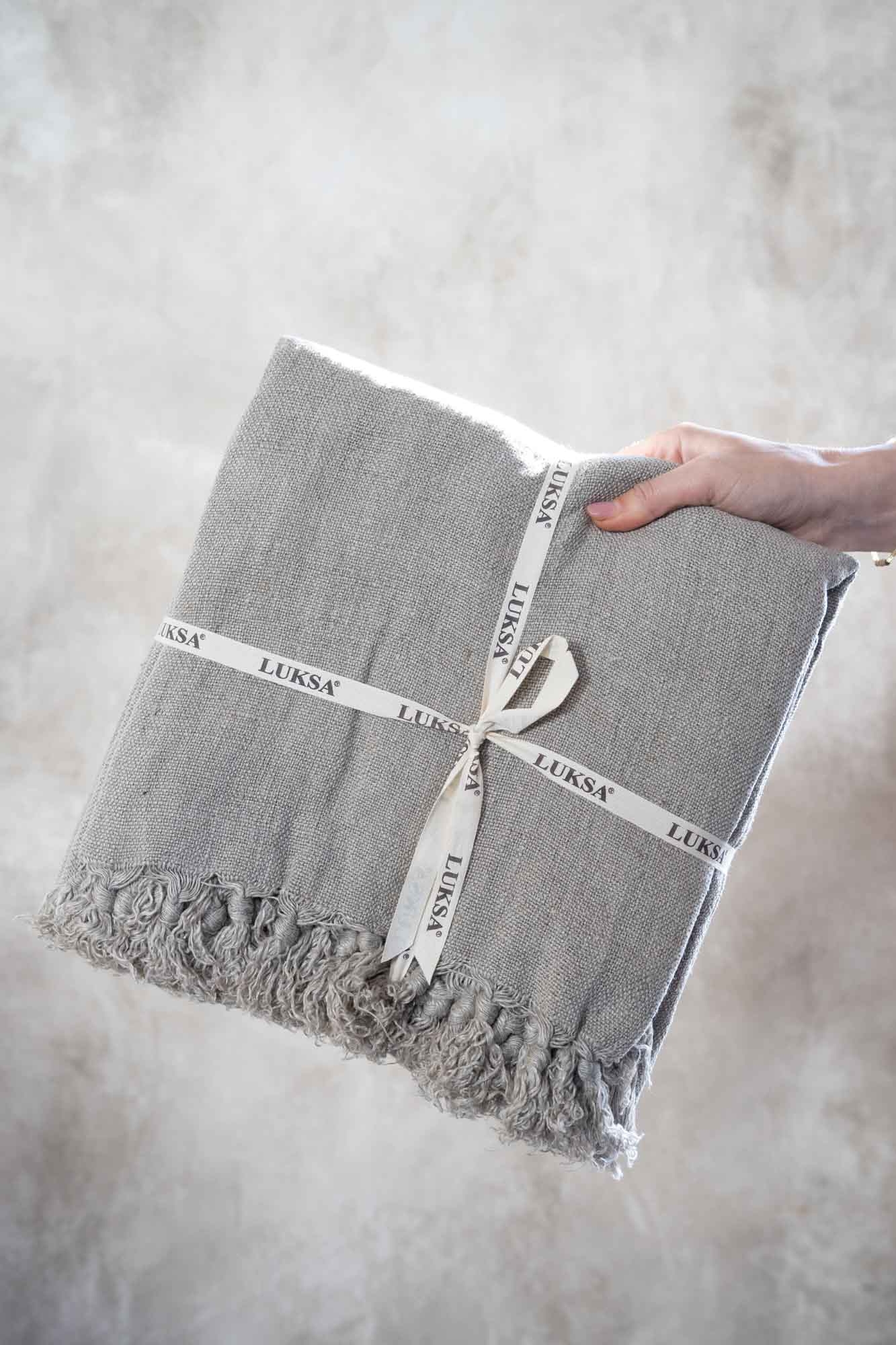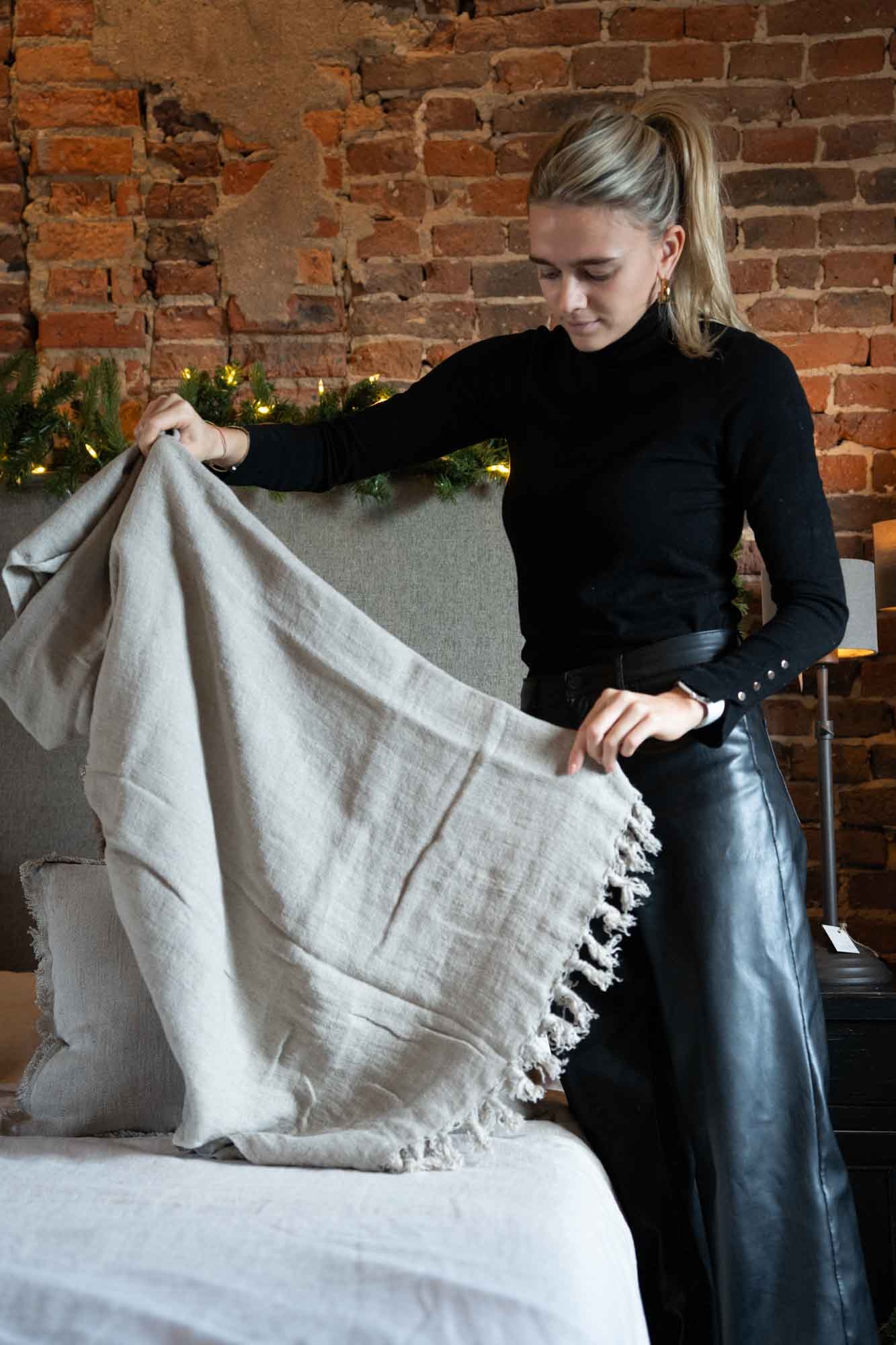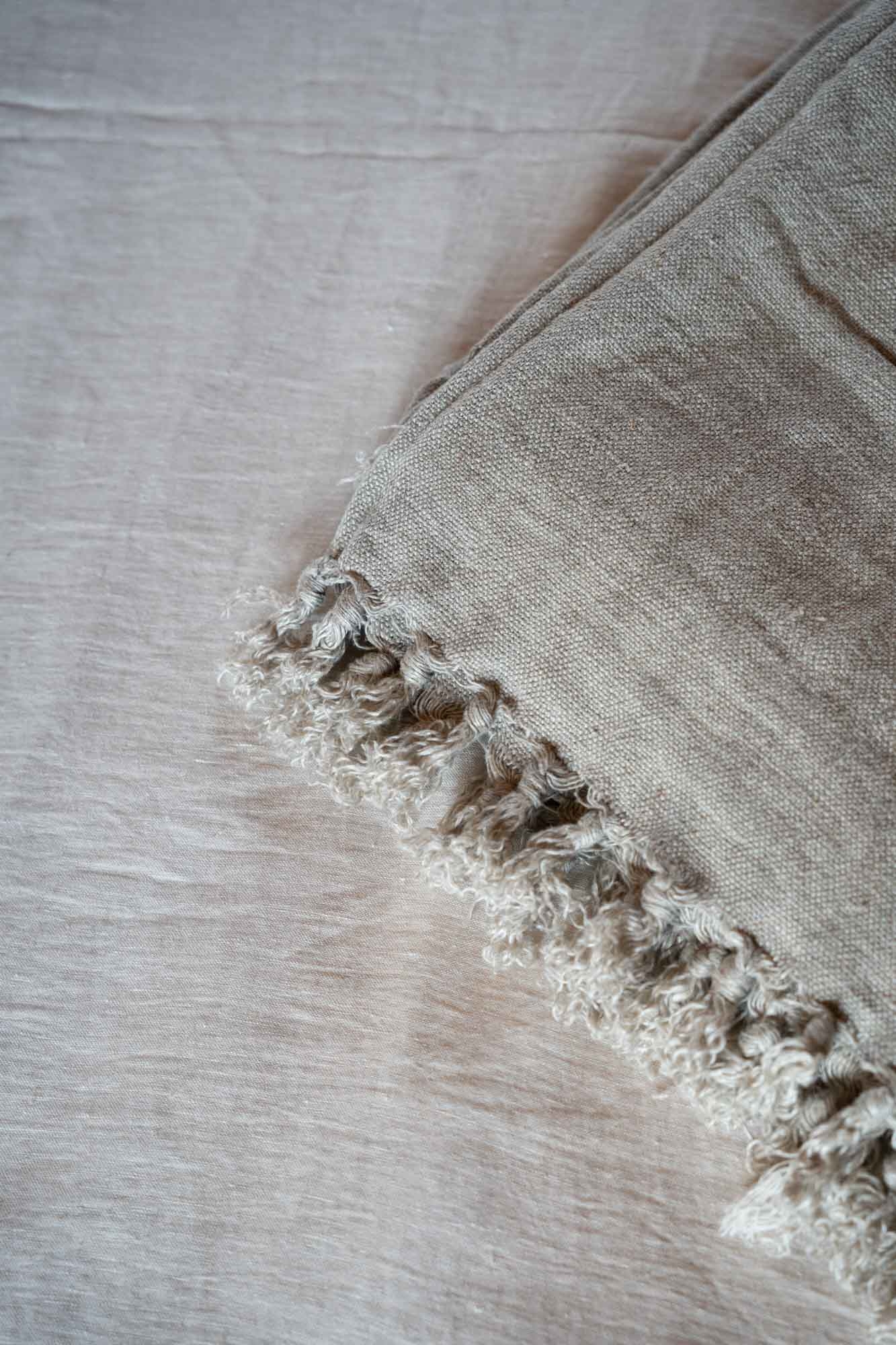 Een tijdloze linnen plaid die rust en warmte uitstraalt. Gemaakt van 100% puur linnen, met een natuurlijke beige tint en een lichte, luchtige structuur. De franjerand voegt een speels, ambachtelijk detail toe, terwijl de stof zacht aanvoelt en prachtig valt.