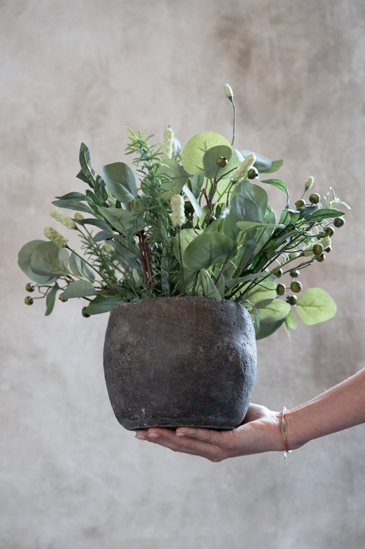 Pot met Boeket Luna is een decoratief arrangement bestaande uit een robuuste pot in donkere tinten, gevuld met een kunstboeket in natuurlijke groentinten met lichte accenten. De combinatie van verschillende bladsoorten en subtiele details zorgt voor een volle, rustige uitstraling.