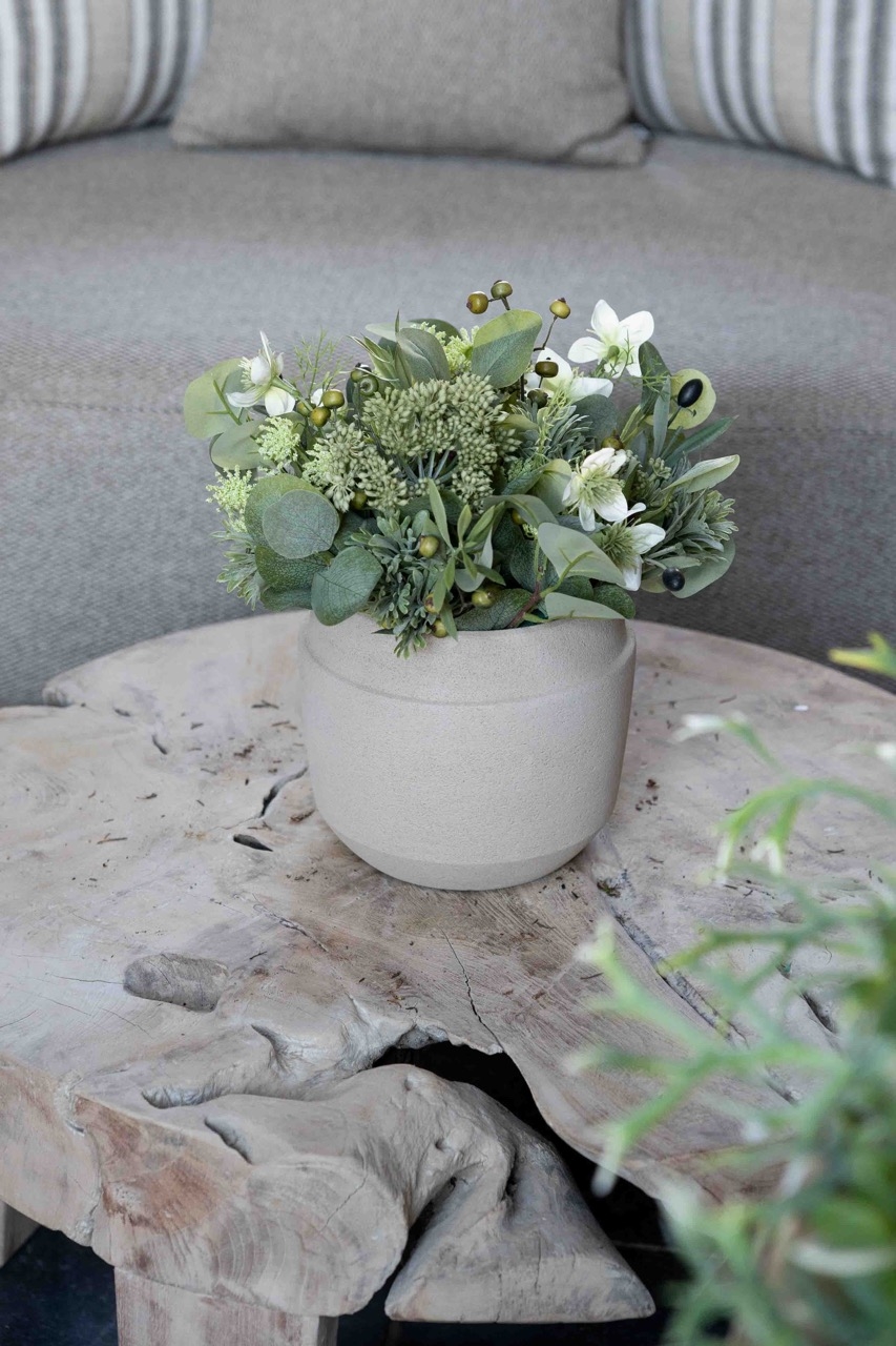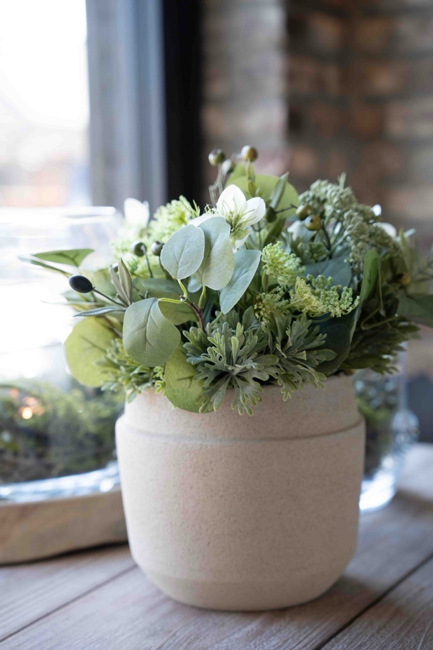 Een lichte pot met een fris en natuurlijk boeket. Sophie is een sfeervolle combinatie van verschillende groene takjes, subtiele besjes en kleine witte bloemetjes. De mix van structuren en tinten geeft het geheel een rustige, luchtige uitstraling die mooi past in een warm en landelijk interieur.