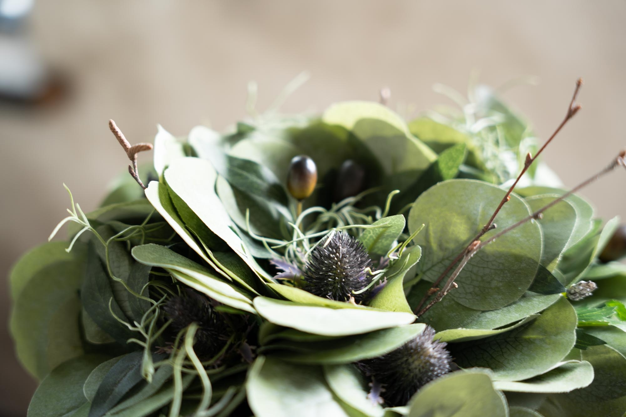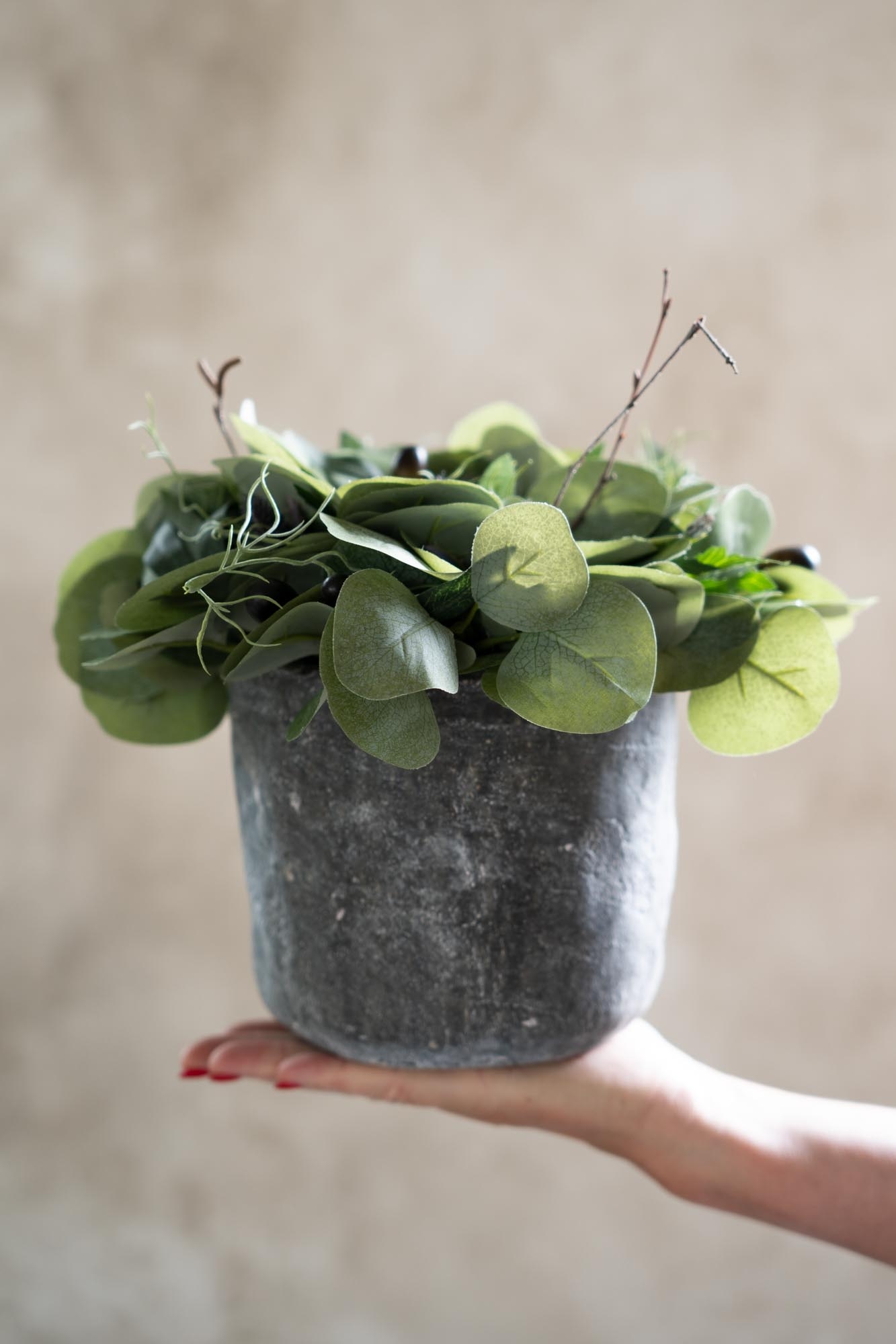 Dit stoere potje is gevuld met een volle bos kunstgroen die meteen voor sfeer zorgt. Zachte eucalyptusbladeren en ranke takjes wisselen elkaar af en geven het arrangement een natuurlijke, levendige uitstraling. Afwisselend met olijftakjes en distels.