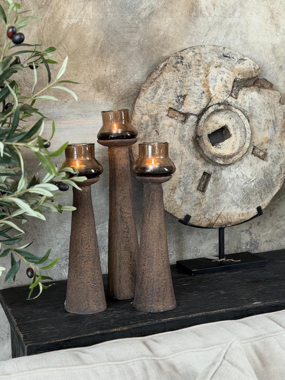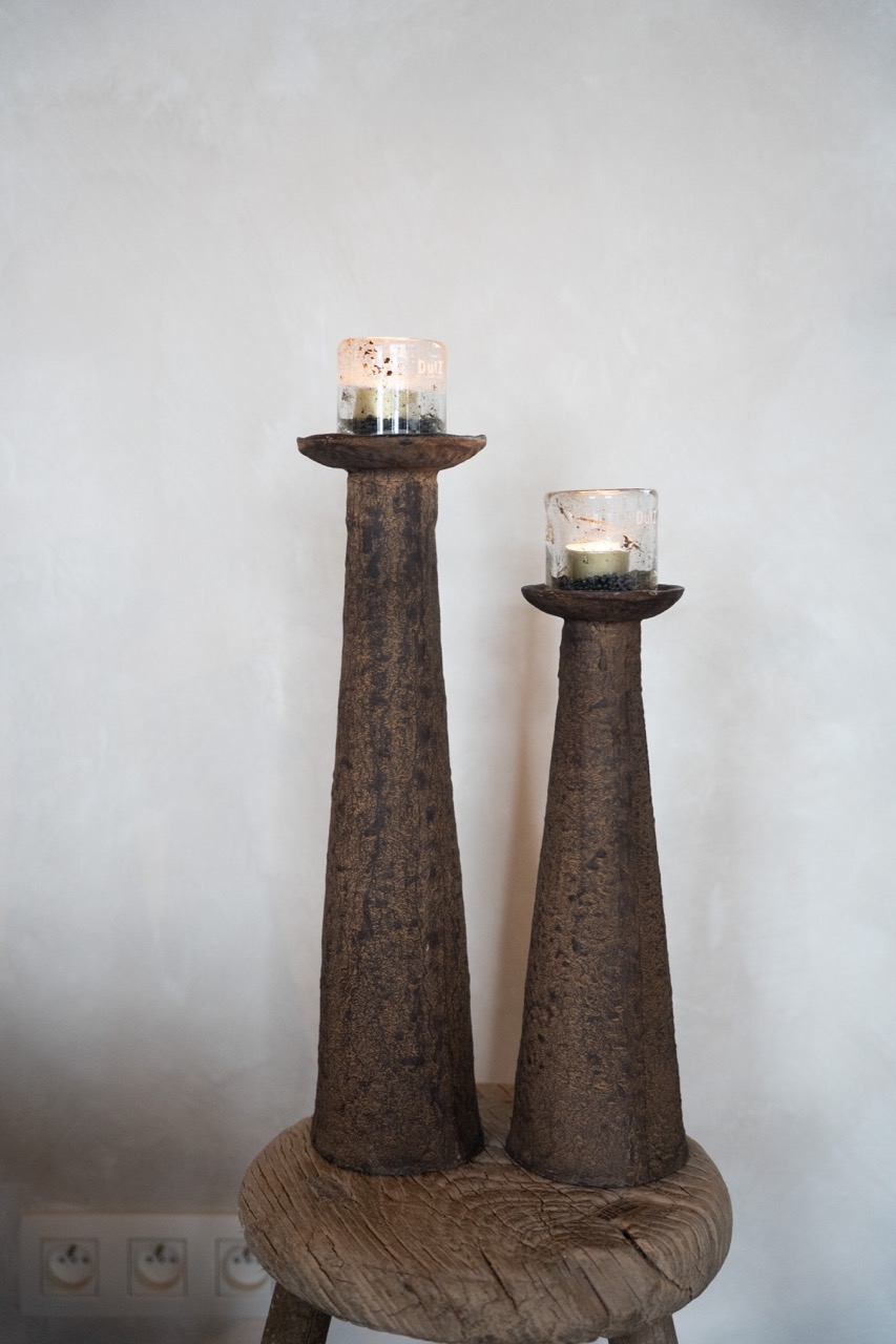 De kandelaar komt het mooist tot zijn recht met een robuust glaswindlicht of een stompkaars, en laat zich prachtig combineren in verschillende hoogtes voor een warm, sfeervol geheel.