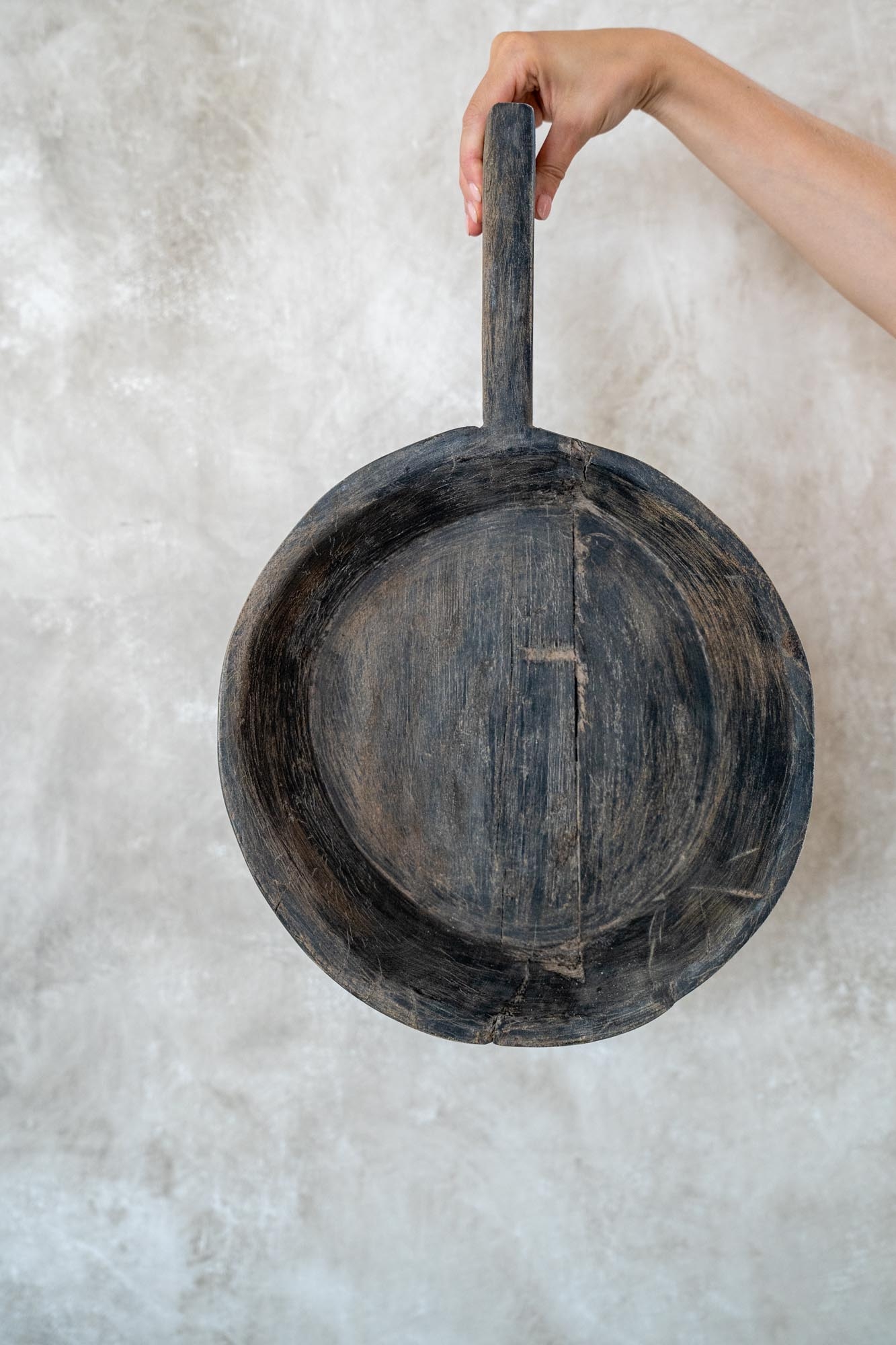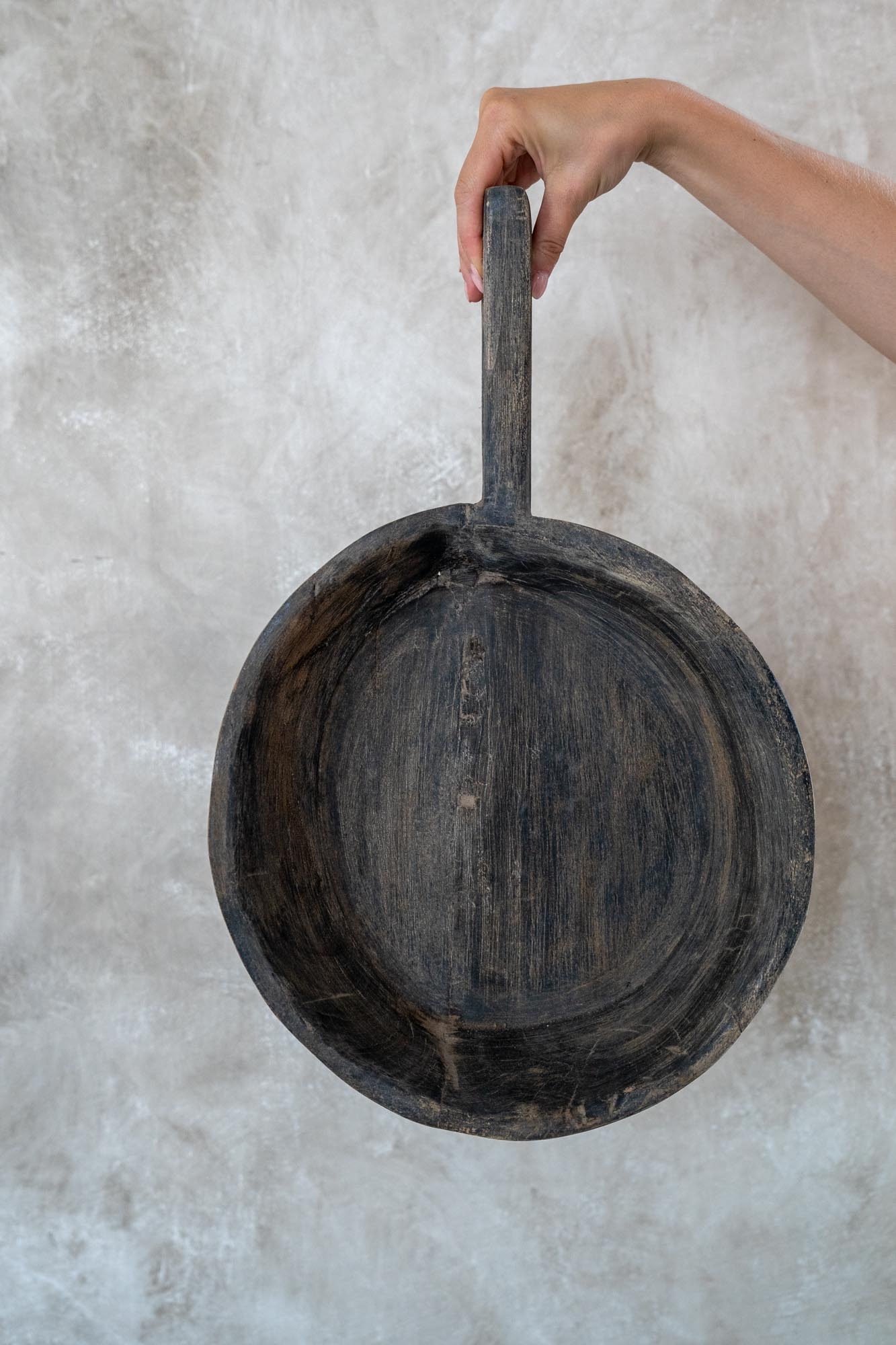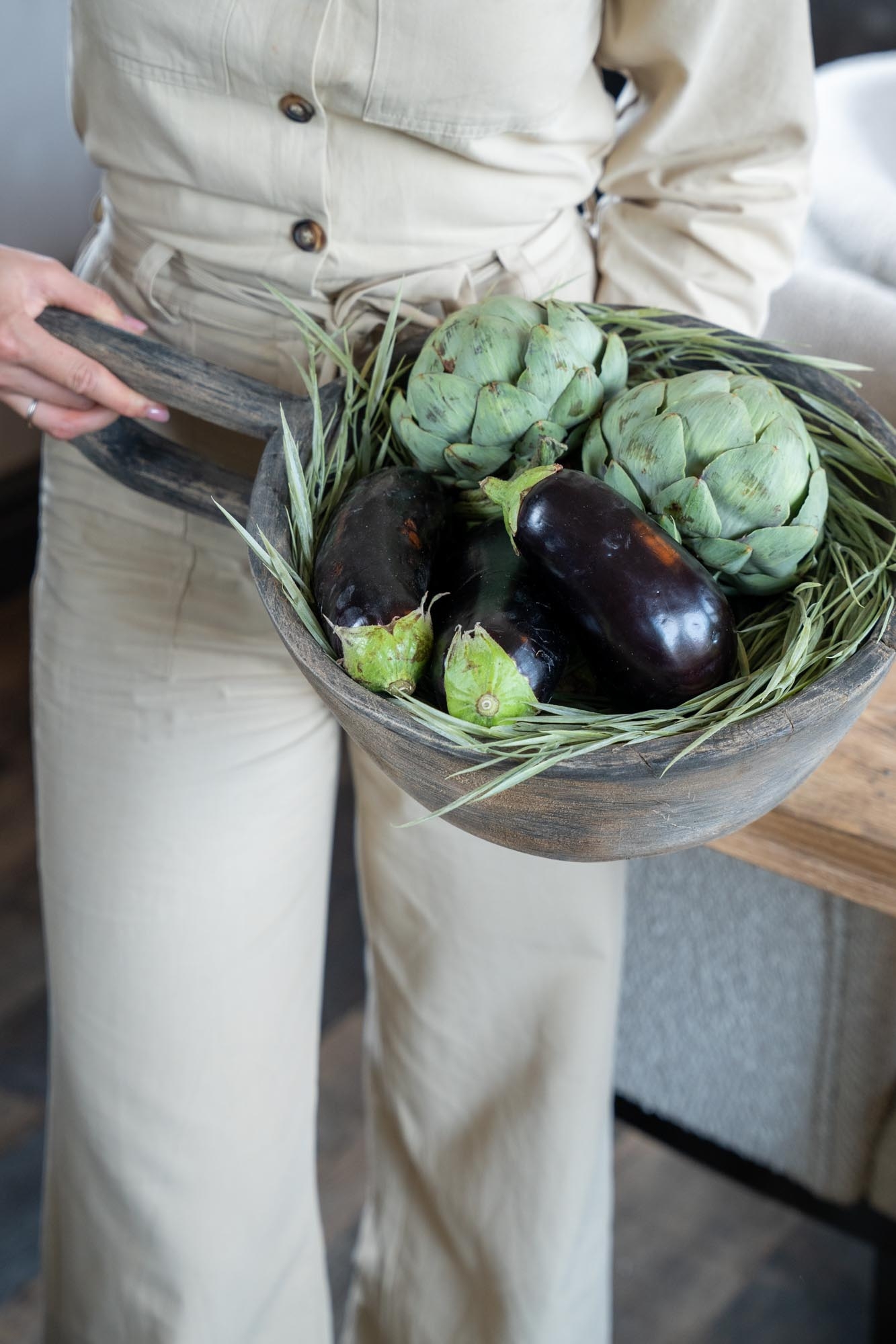 Schaal Mauro is een stoere houten schaal met een robuust handvat, ambachtelijk gemaakt en uitgevoerd in donker verweerd hout.