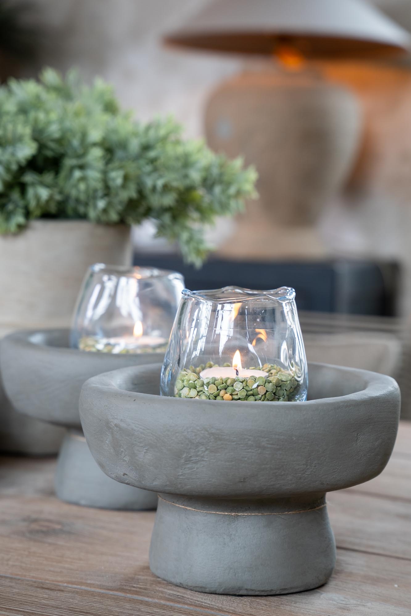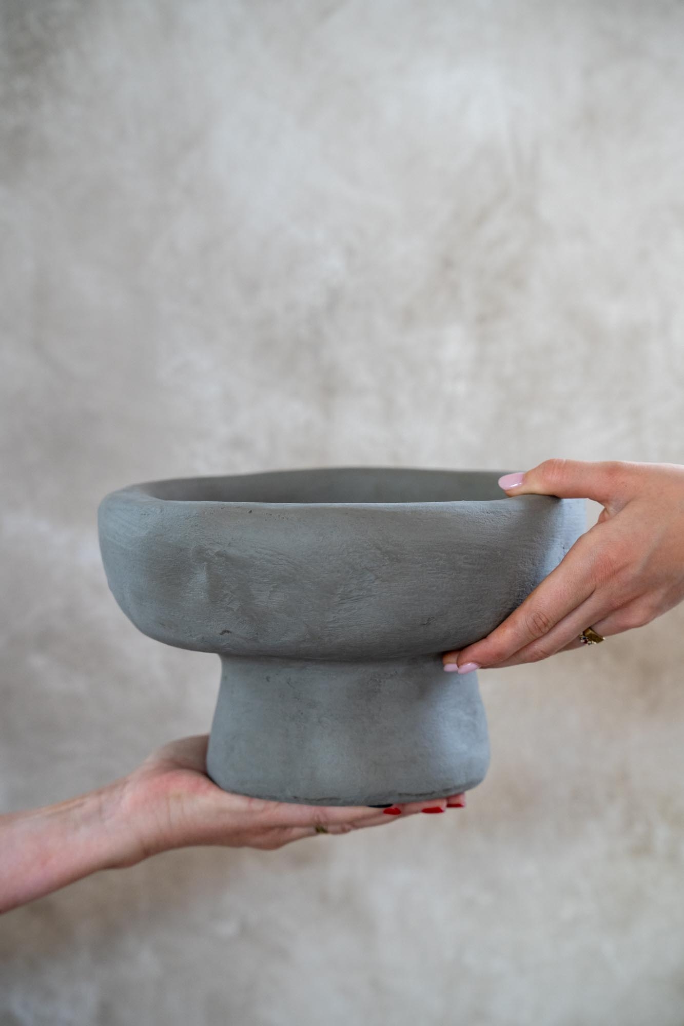 Deze ronde schaal op voet in een zachte grijstint is een prachtig en veelzijdig stylingitem. Het stevige, sobere ontwerp en de matte afwerking maken het een tijdloze toevoeging aan elk interieur.