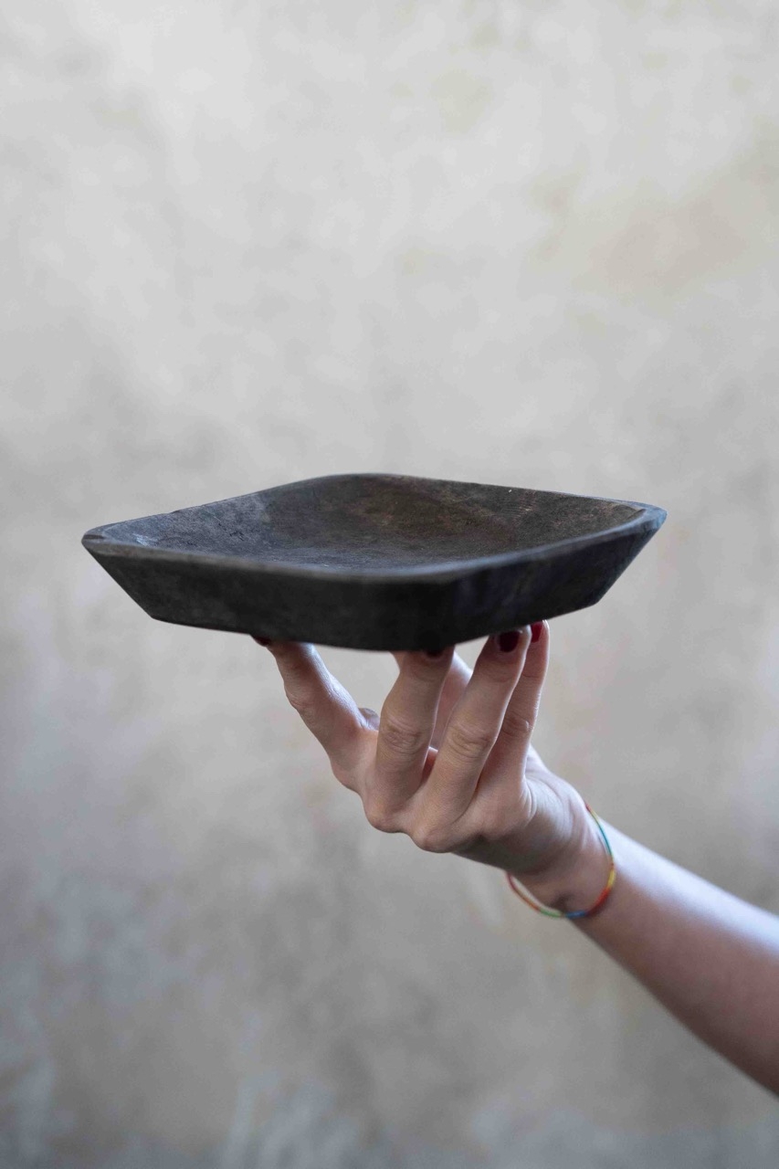 Het vierkante schaaltje heeft een stoere, natuurlijke uitstraling en is gemaakt van donker hout met een licht verweerde afwerking. De robuuste vorm en warme kleur maken het een veelzijdig item dat in elk interieur past.