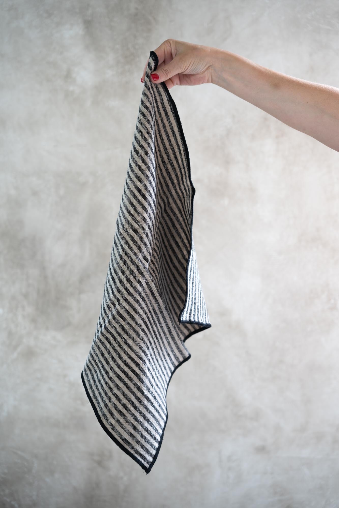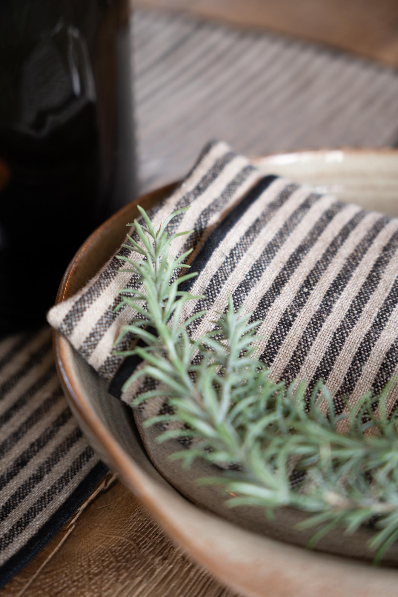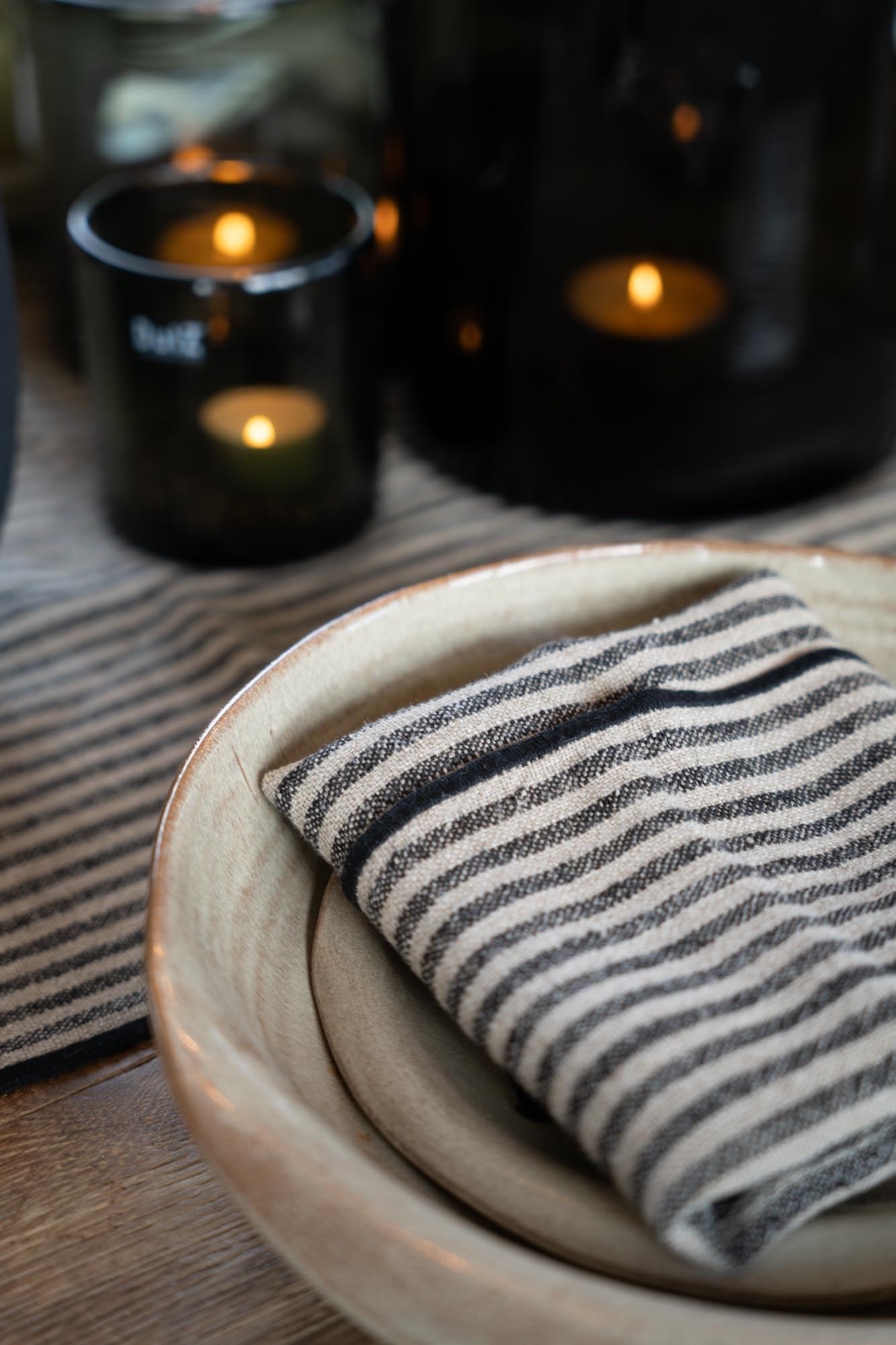Geef je tafelsetting een natuurlijke en stijlvolle uitstraling met dit servet van hoogwaardig linnen. Het subtiele zwart-beige streeppatroon brengt rust en elegantie samen, waardoor elke maaltijd een moment van verfijning wordt.