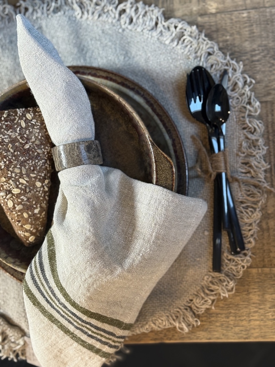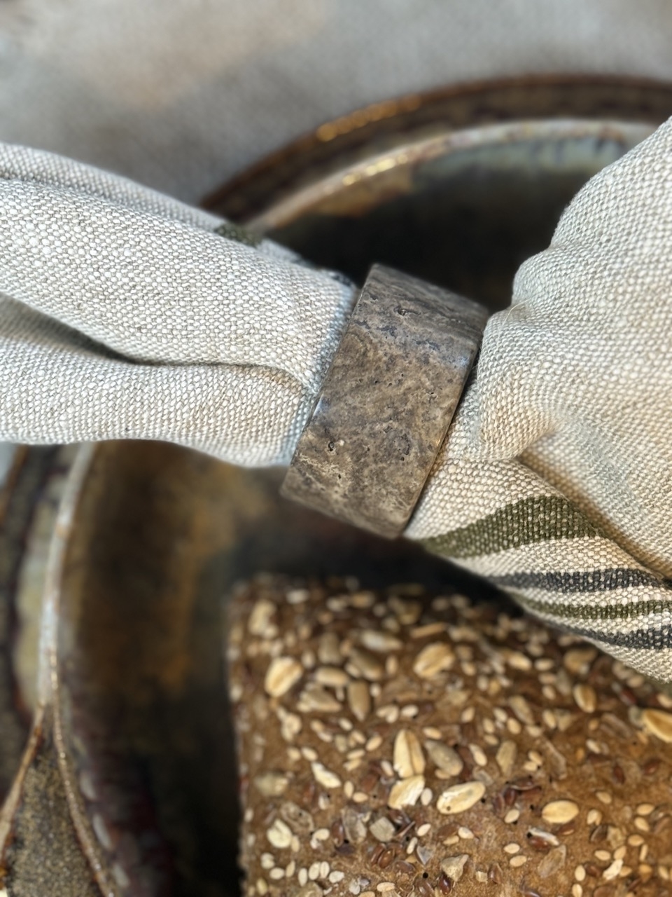 Deze stijlvolle servetring is vervaardigd uit natuursteen en heeft een robuuste, organische uitstraling. De grijsbruine tint en subtiele marmerstructuur geven elk exemplaar een uniek karakter. Perfect om je tafelsetting een verfijnde en natuurlijke touch te geven, of het nu voor een casual diner of een feestelijke gelegenheid is.