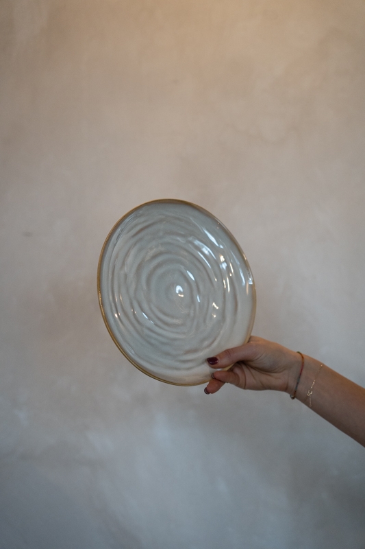 Dit beige ontbijtbord is een stijlvolle en veelzijdige toevoeging aan het servies. De zachte beigetint in combinatie met de subtiele glans geeft het bord een rustige, elegante uitstraling. Het licht golvende oppervlak en de verfijnde rand zorgen voor een ambachtelijke en luxe look.