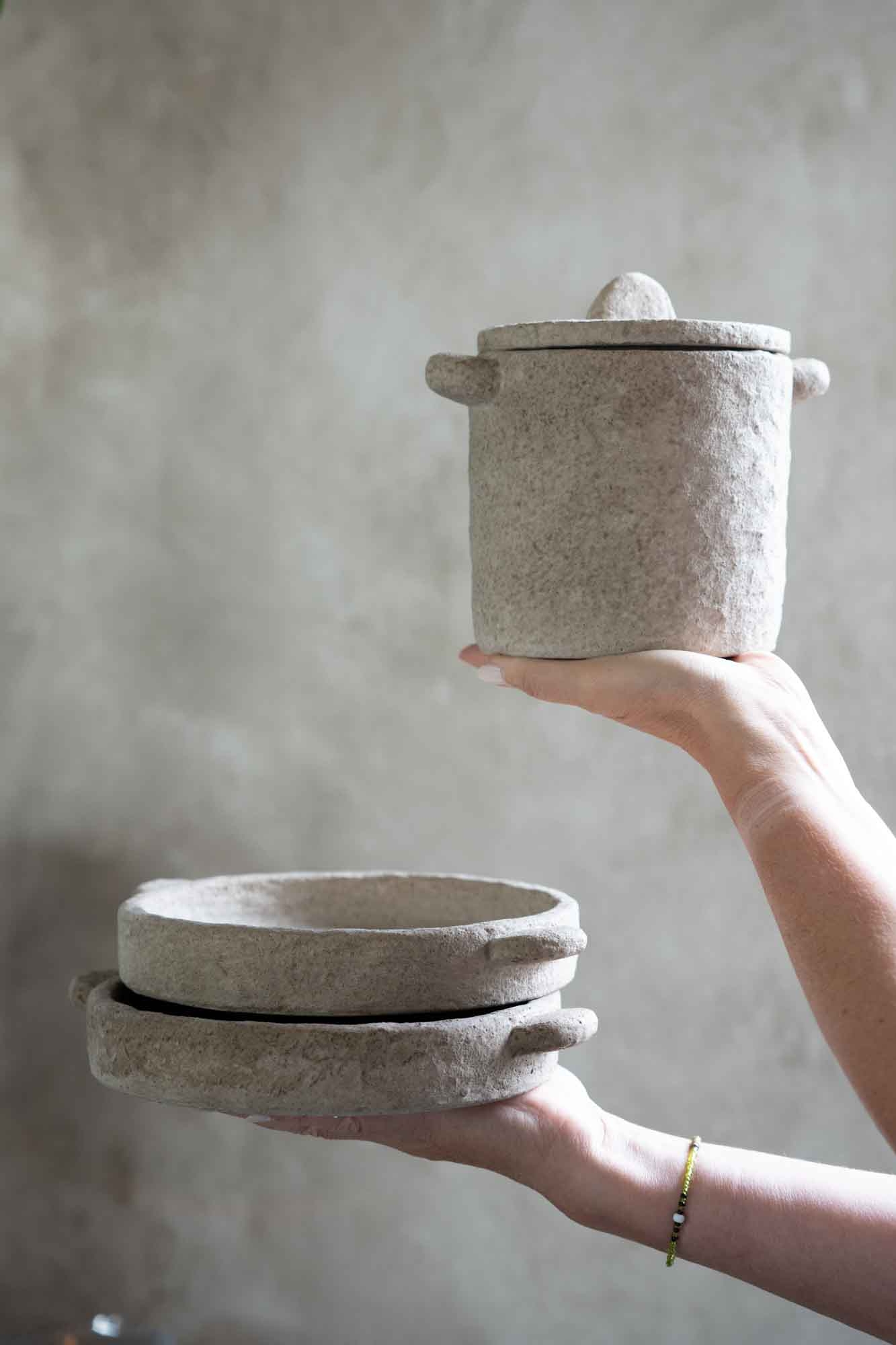 Deze set bestaat uit een groot beige potje en twee bijpassende beige schaaltjes. Samen vormen ze een prachtig geheel dat zowel praktisch als decoratief te gebruiken is. De neutrale tinten en robuuste afwerking geven de set een rustige, authentieke uitstraling, waardoor ze moeiteloos in ieder interieur past. Zet het potje bijvoorbeeld in de keuken of woonkamer voor extra sfeer, terwijl de schaaltjes ideaal zijn om kleine accessoires, kaarsjes of hapjes in te presenteren. De combinatie van de verschillende formaten zorgt voor een speels, maar toch stijlvol effect. Een tijdloze set die jarenlang mee kan en steeds opnieuw een plek vindt in je interieur.